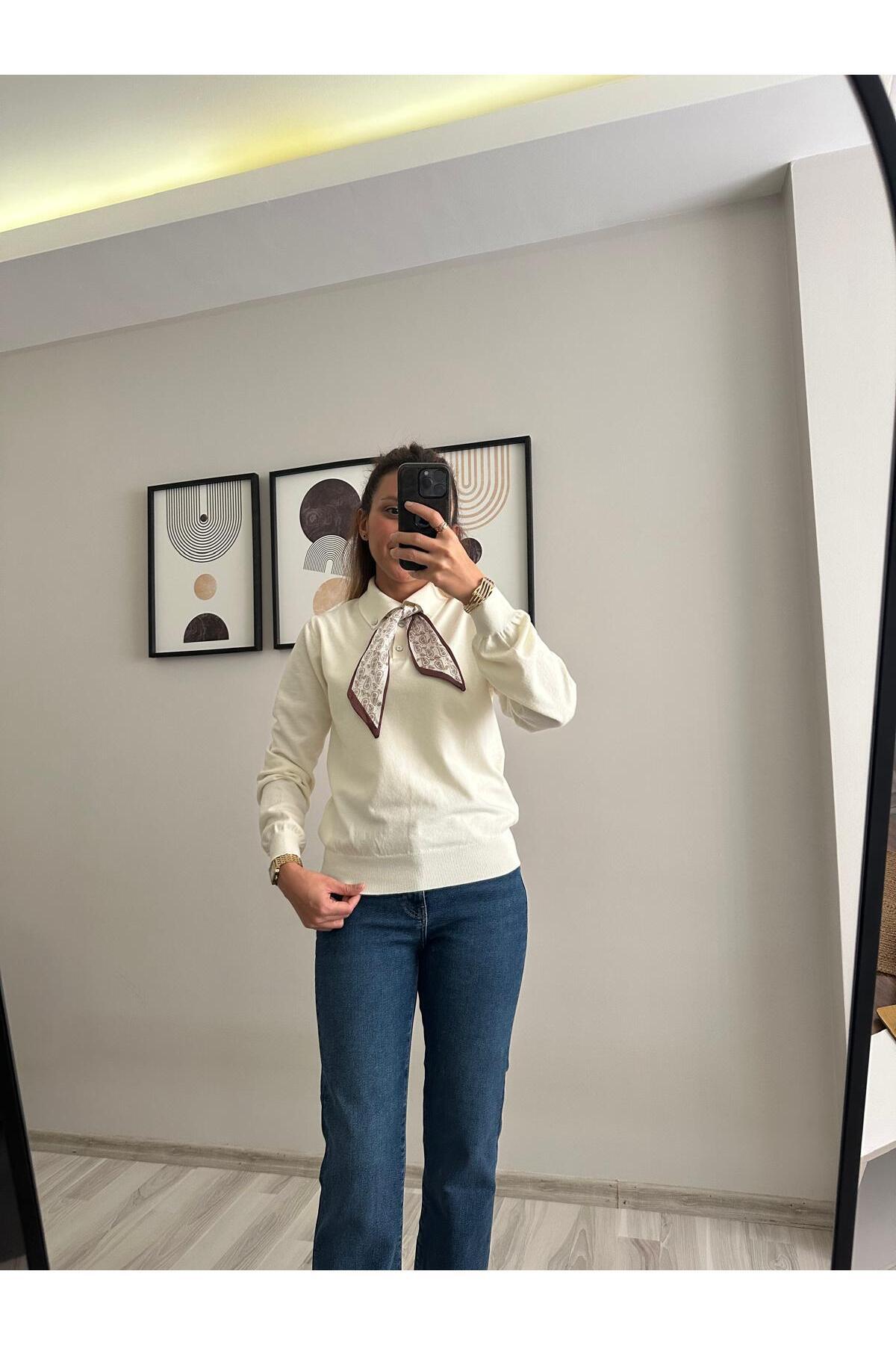 Yumuşak Dokulu - Saten Fularlı - Polo Yaka Tiriko Uzun Kollu Kazak Yumuşak Dokulu - Saten Fularlı - Polo Yaka Tiriko Uzun Kollu Kazak 5837 Standart