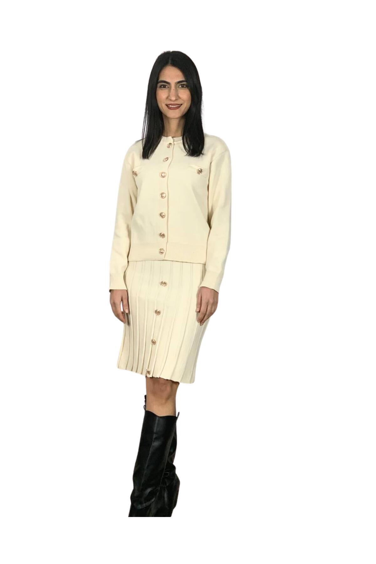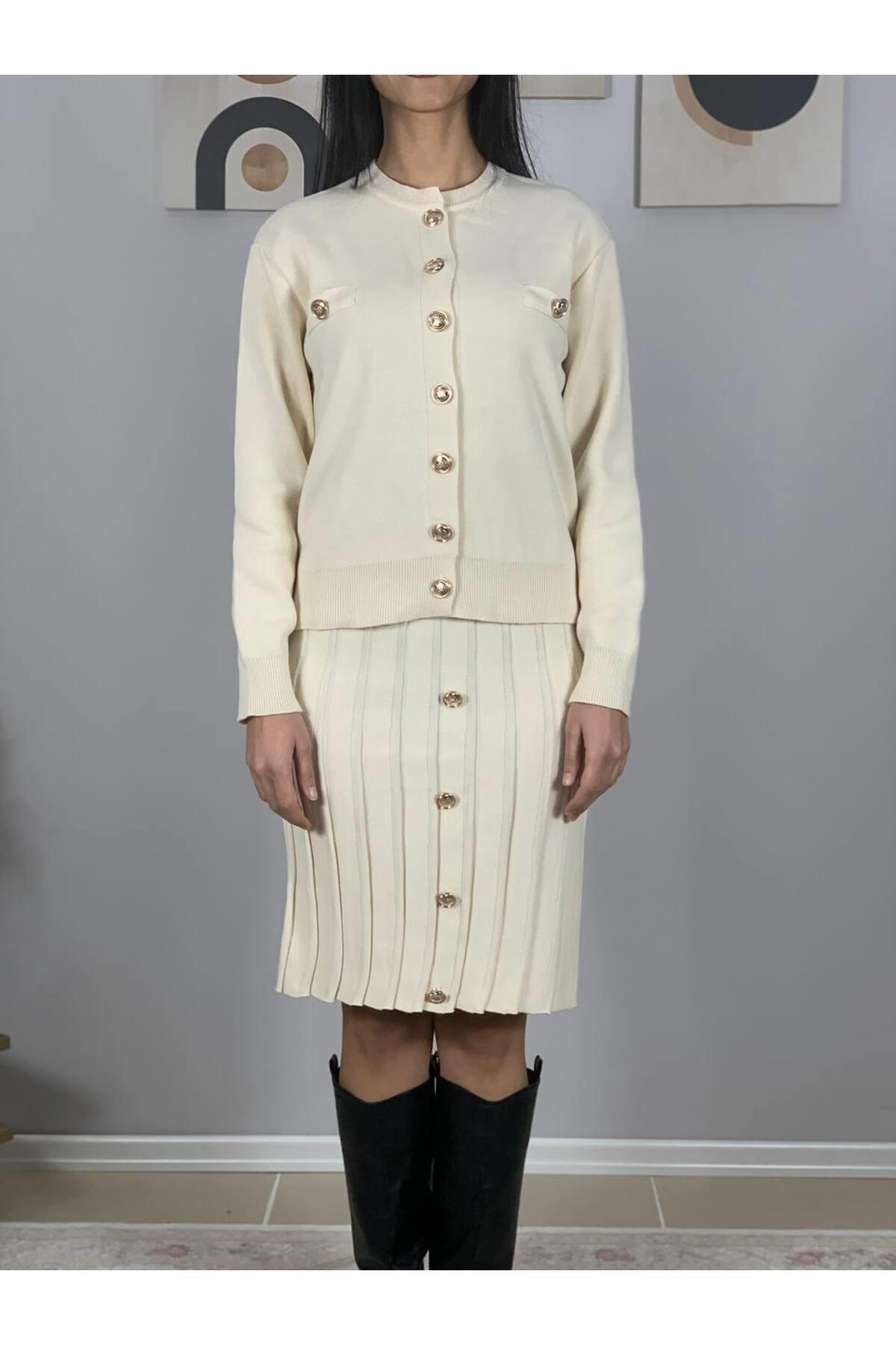 Kadın Ekru Gold Düğmeli Triko Pileli Hırka Etek Takım Ekru M Kadın Ekru Gold Düğmeli Triko Pileli Hırka Etek Takım Ekru M EPHE0001 L
