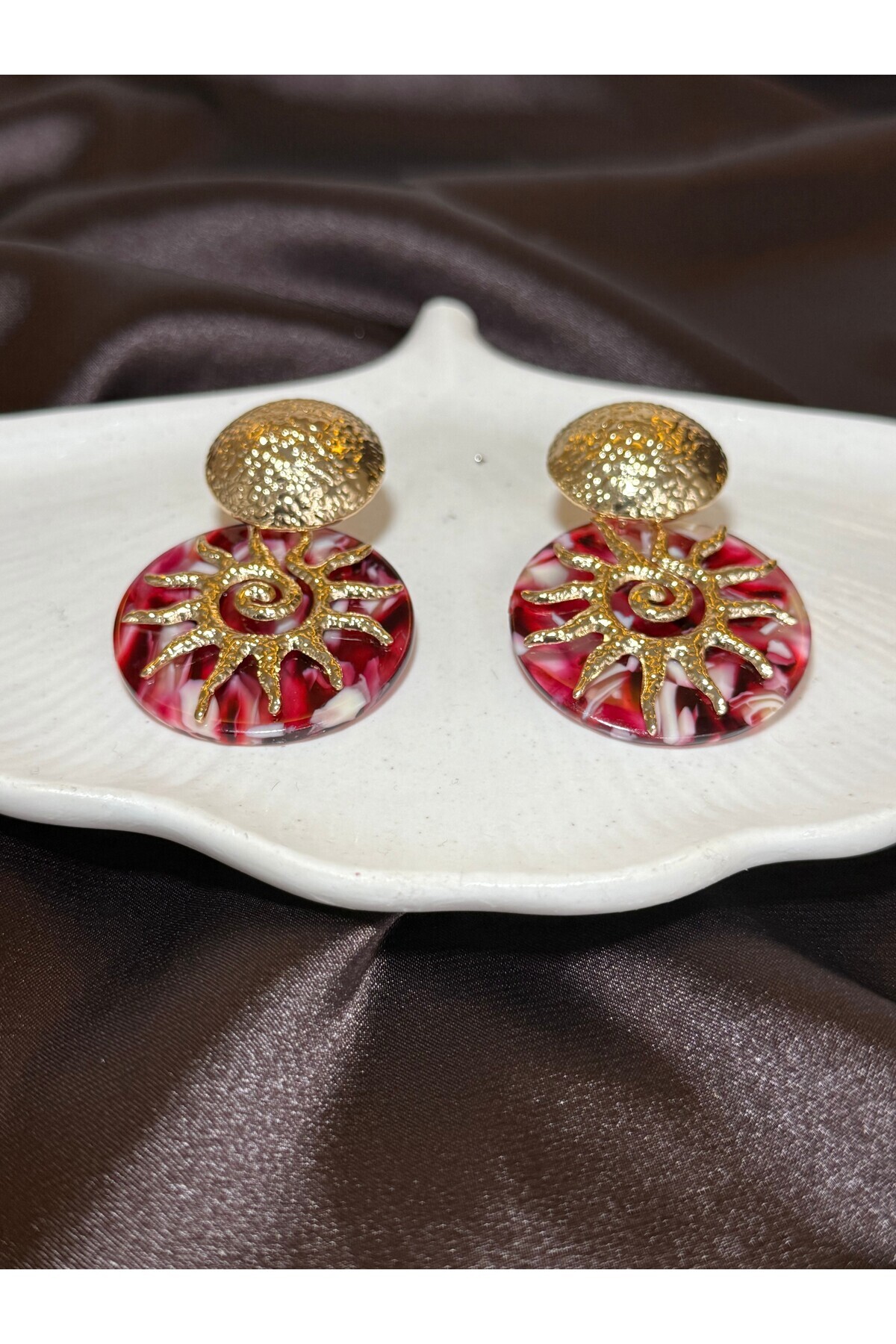 Bordo Leopar Desenli Güneş Figürlü Büyük Sallantılı Küpe Bordo Leopar Desenli Güneş Figürlü Büyük Sallantılı Küpe ED71 تک سایز