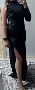 Dik Yaka Taş Detaylı Yırtmaçlı kadıfe Abiye Elbise 582310 SIYAH Dik Yaka Taş Detaylı Yırtmaçlı kadıfe Abiye Elbise 582310 SIYAH M
