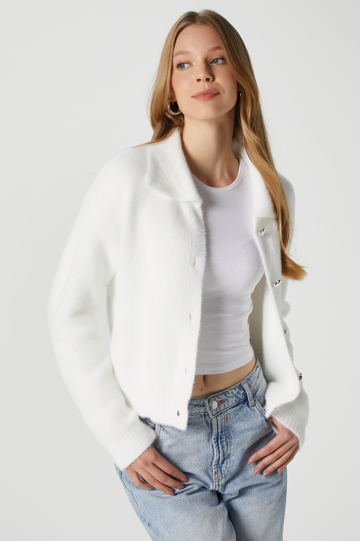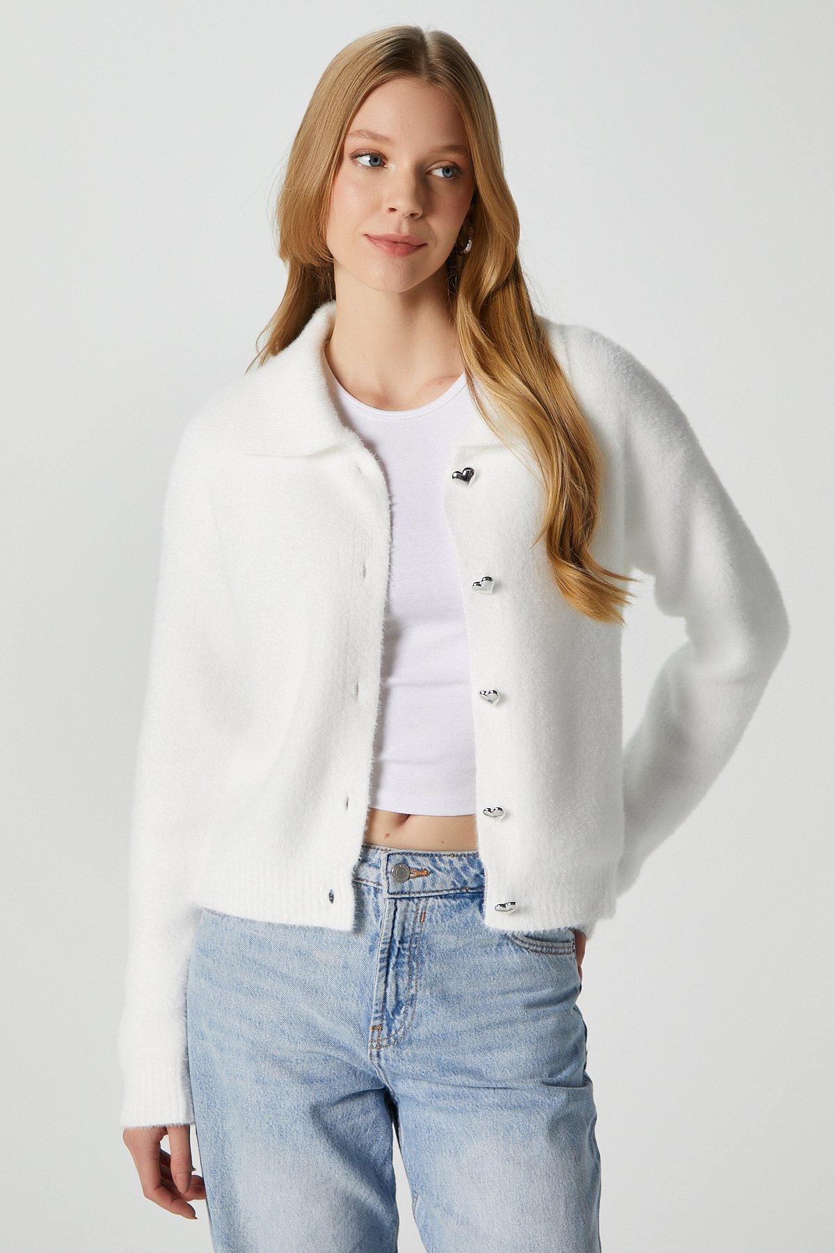 Kadın Date Yumuşak Sakallı Kalp Düğmeli Polo Yaka Ekru Triko Hırka Kadın Date Yumuşak Sakallı Kalp Düğmeli Polo Yaka Ekru Triko Hırka 1571 L