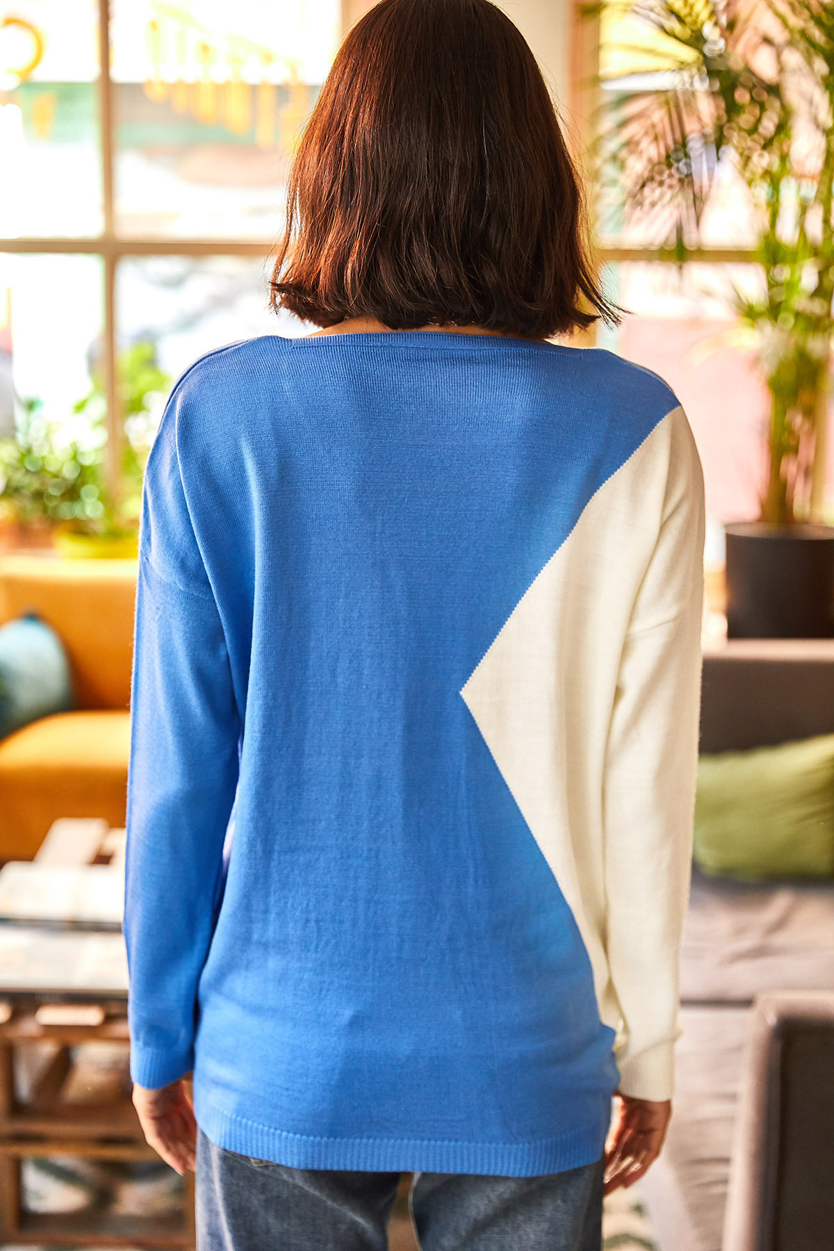 Kadın Mavi V Yaka Salaş Renk Detaylı İnce Triko Kazak KZK-19001062 Kadın Mavi V Yaka Salaş Renk Detaylı İnce Triko Kazak KZK-19001062 Tek Ebat