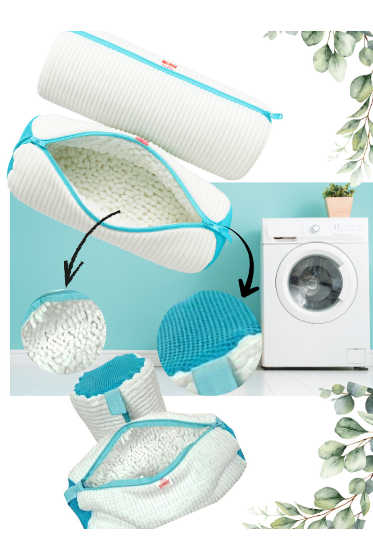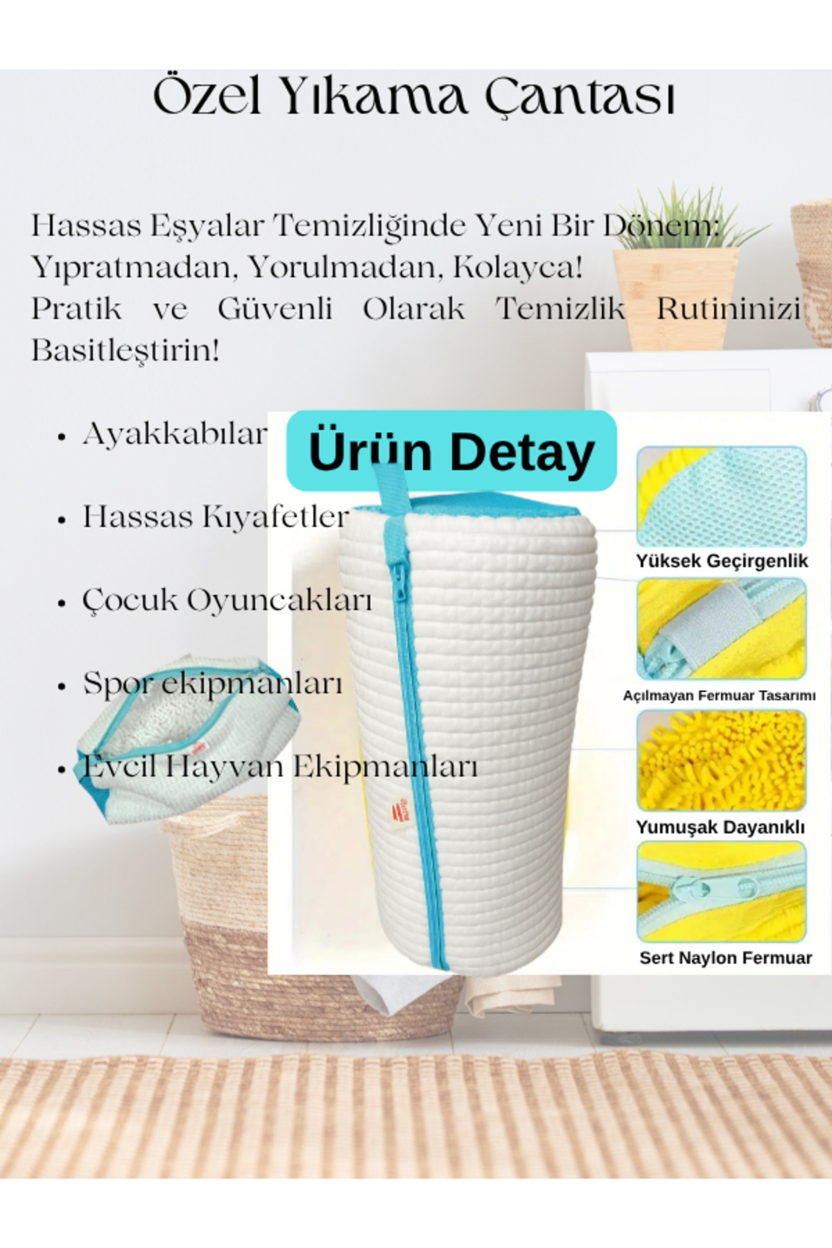 - Diğer Özellikler : Ürünün Faydaları ve Yıkama Notları: • Ayakkabılar: Özel dokulu iç yüzey, ayakkabıların (sneaker, günlük, çocuk, yürüyüş) makinede yıpranmasını ve deforme olmasını engeller. • Hassas Kıyafetler: İpekli ve hassas kumaşların yıpranmasını önleyerek koruma sağlar. • Çocuk Oyuncakları: Pelüş oyuncakların makinede yıkanırken zarar görmesini engeller. • Spor Malzemeleri: Dizlikler, dirseklikler ve diğer spor aksesuarları için hijyenik temizlik sağlar. • Evcil Hayvan Malzemeleri: Tasma, oyuncak ve küçük yataklar için hijyenik bir temizlik çözümüdür. • Makine Koruması: Çanta, içine konulan ekipmanların tambur içinde çarpmasını engelleyerek hem çamaşır makinenizin ömrünü uzatır hem de yıkanan ekipmanları korur.