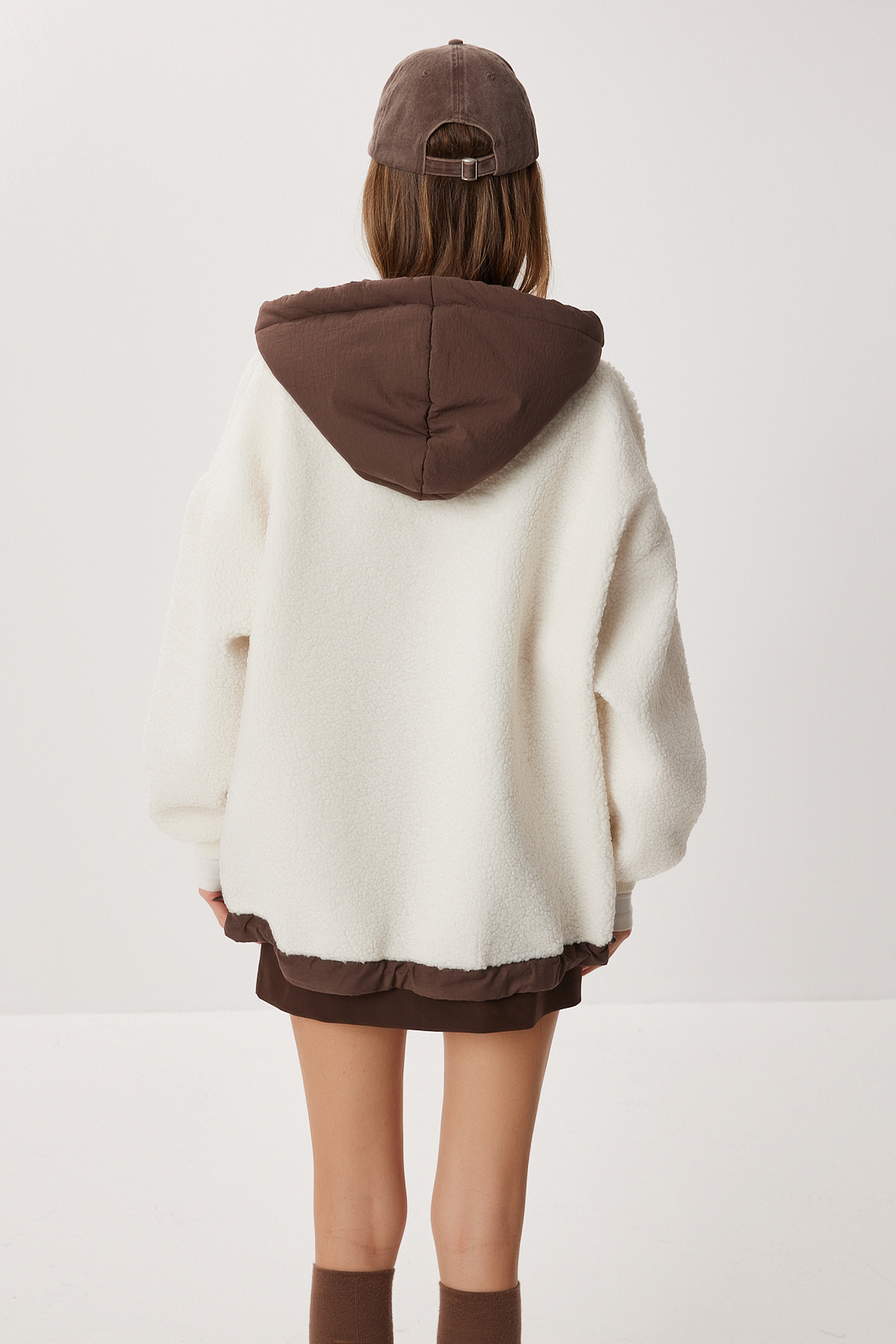 Oversize Kapüşonlu Kontrast Peluş Mont LFG0172 EKRU Oversize Kapüşonlu Kontrast Peluş Mont LFG0172 EKRU M/L