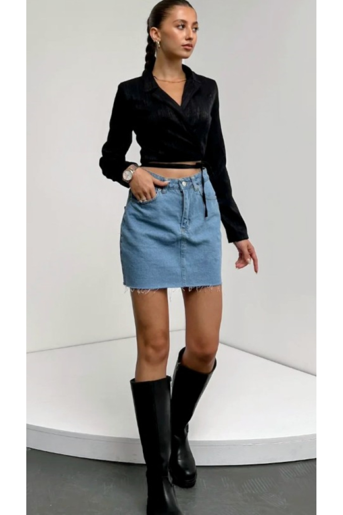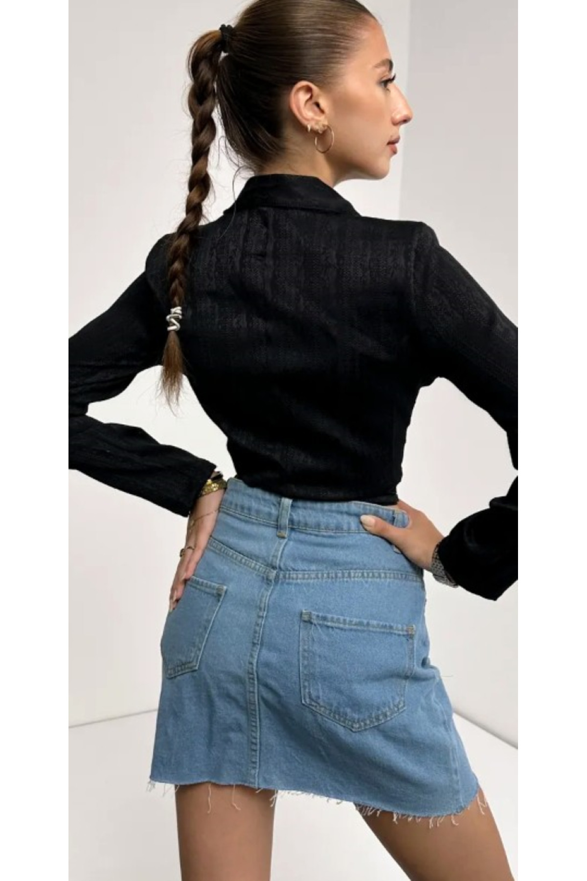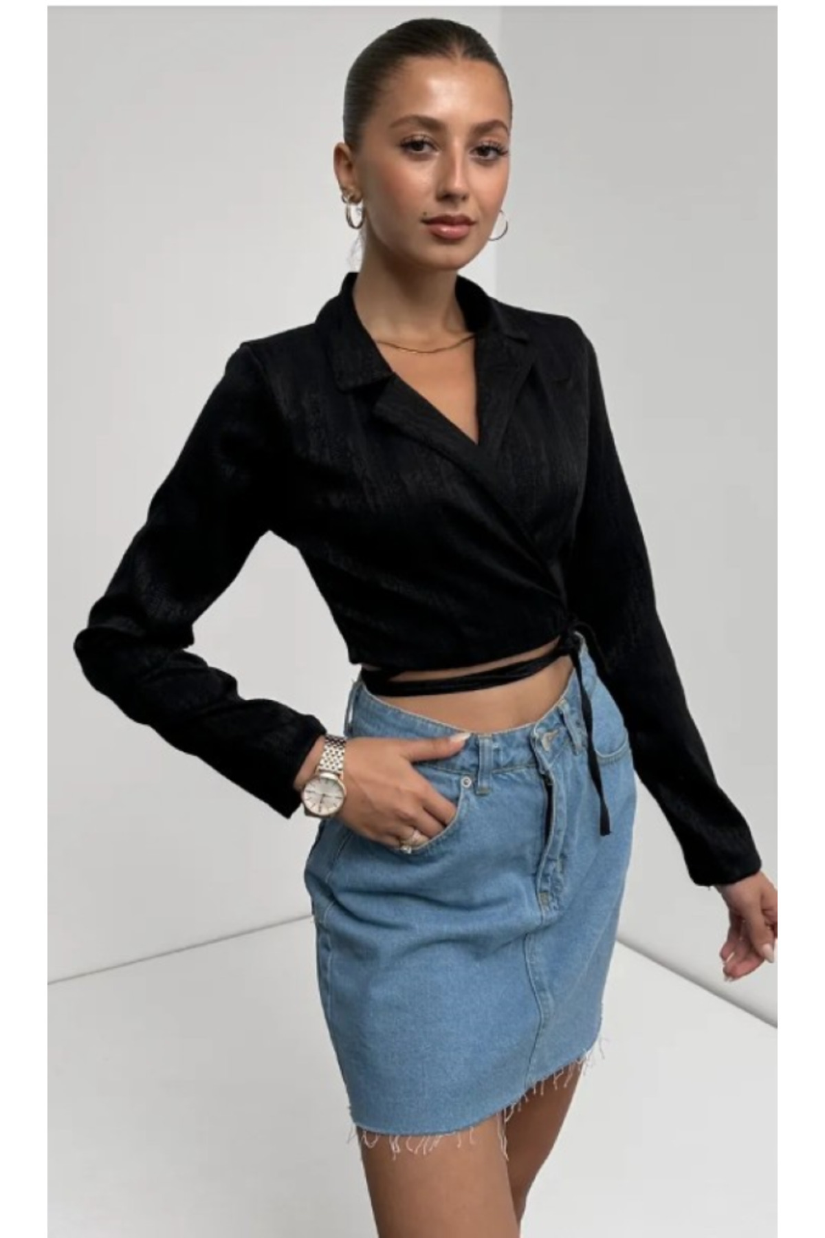 Kadın Siyah Gömlek Yaka Beli Bağlamalı Crop Bluz Kadın Siyah Gömlek Yaka Beli Bağlamalı Crop Bluz SNTMCR01 XL