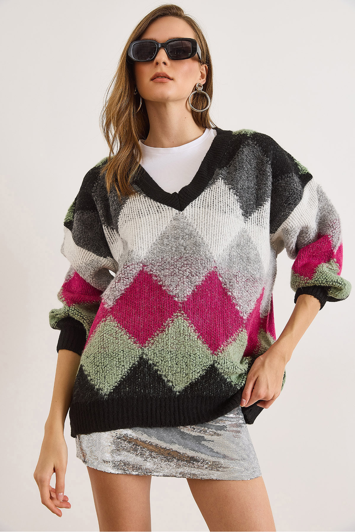 Kadın Gri V Yaka Baklava Detaylı Oversize Triko Kazak KZK-19001050 Kadın Gri V Yaka Baklava Detaylı Oversize Triko Kazak KZK-19001050 تک سایز