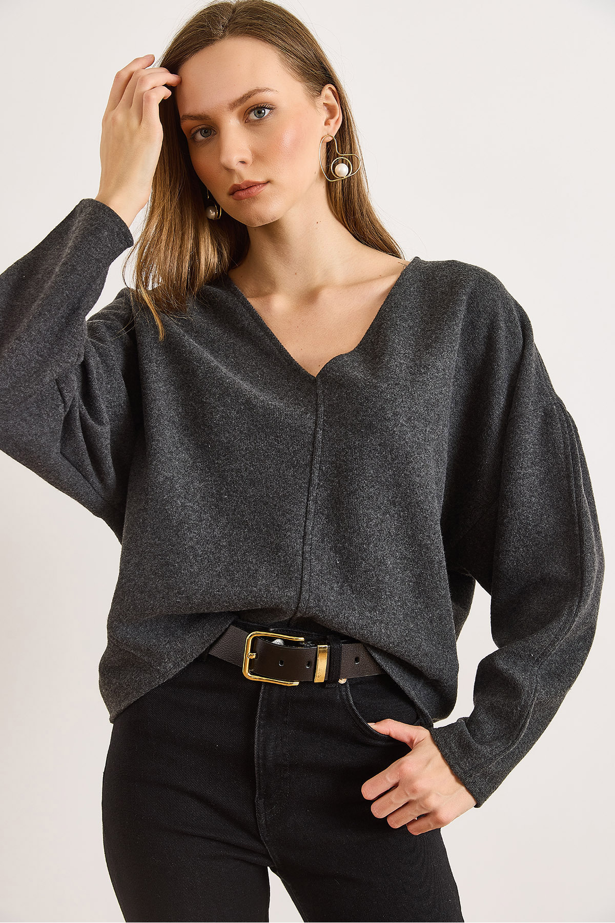 Kadın Füme V Yaka Dikiş Detaylı Dökümlü Selanik Bluz BLZ-19003166 Kadın Füme V Yaka Dikiş Detaylı Dökümlü Selanik Bluz BLZ-19003166 L