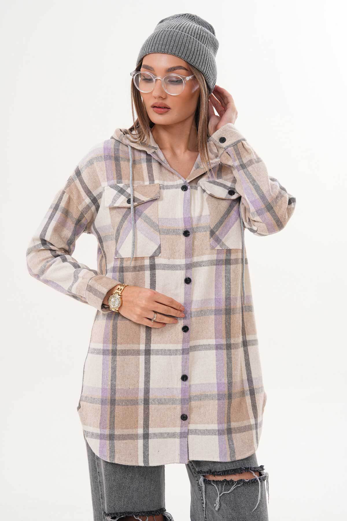 Kadın Oduncu Kahverengi Bej Lila Çizgili Kapşonlu Gömlek Kadın Oduncu Kahverengi Bej Lila Çizgili Kapşonlu Gömlek 001069 XL