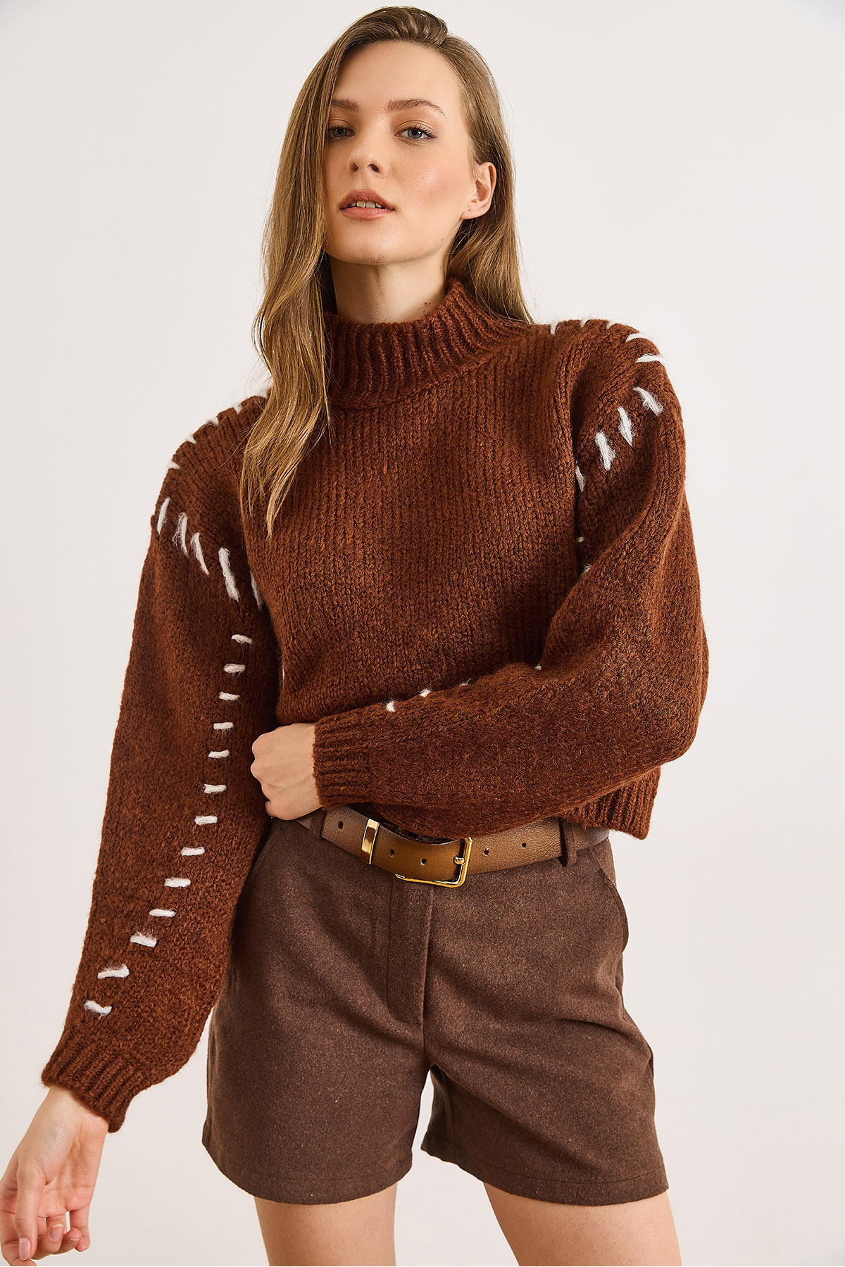 Kadın Camel Gül Desenli Kalın Triko Kazak KZK-19001054 Kadın Camel Gül Desenli Kalın Triko Kazak KZK-19001054 تک سایز