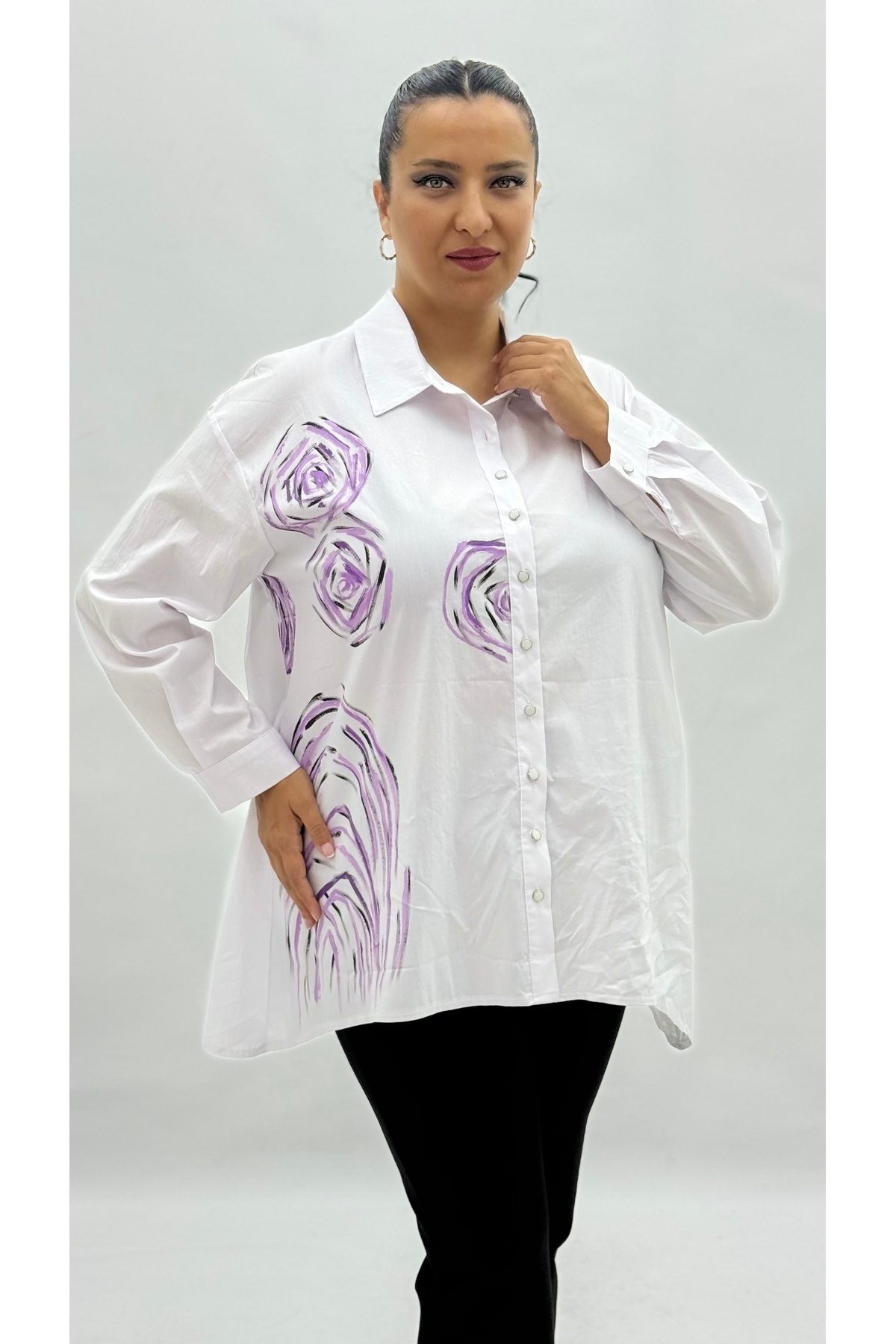 Büyük Beden Pamuklu Düğmeli Uzun Kol Oversize Kadın Gömlek Büyük Beden Pamuklu Düğmeli Uzun Kol Oversize Kadın Gömlek 22762 56