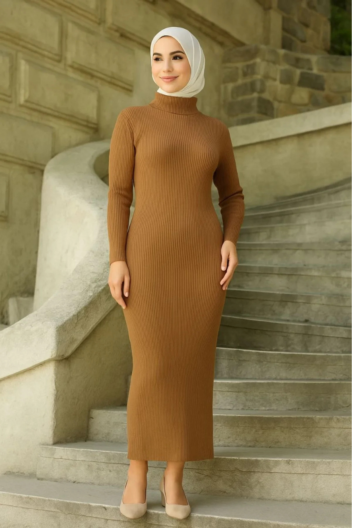 Kadın Tesettür Triko Elbise - Kahverengi 01 Kadın Tesettür Triko Elbise - Kahverengi 01 METC-0316 Standart
