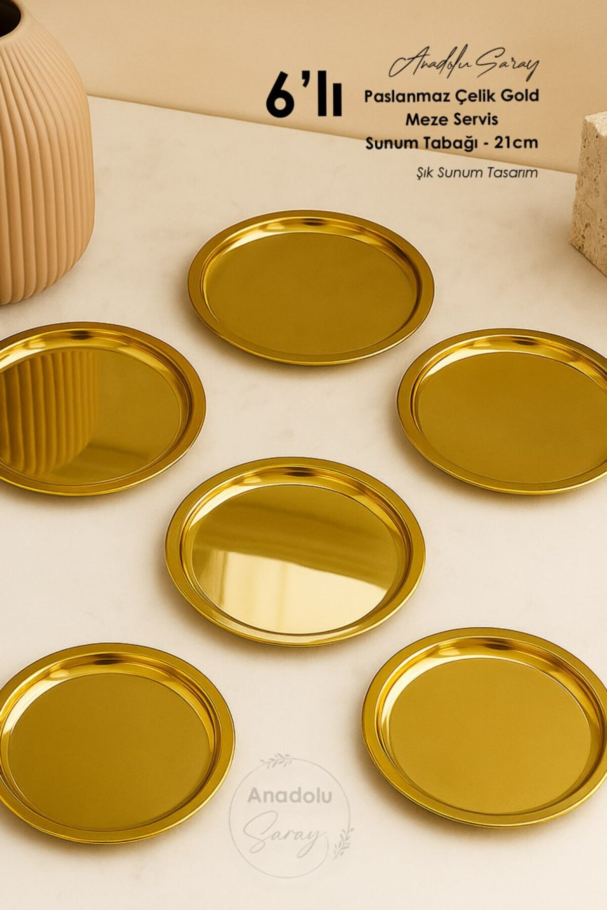 6 ADET Paslanmaz Çelik 21cm Gold Meze Servis ve Sunum Tabağı Şık Sunum Tasarım 6 ADET Paslanmaz Çelik 21cm Gold Meze Servis ve Sunum Tabağı Şık Sunum Tasarım 6li.Hurrem.Tabak تک سایز