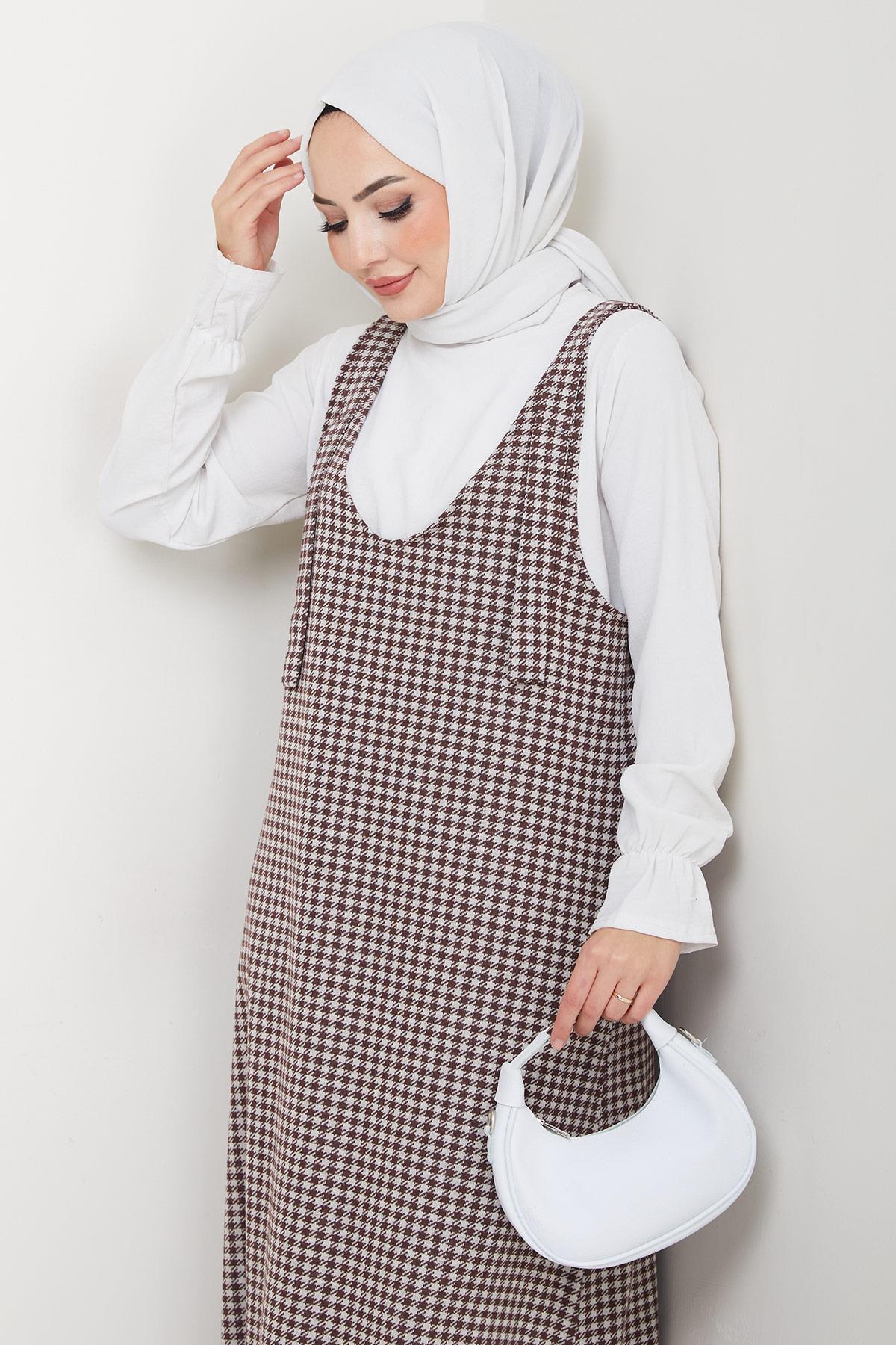 Kaz Ayağı Desen Jile Elbise Kahverengi HM2865 Kaz Ayağı Desen Jile Elbise Kahverengi HM2865 48