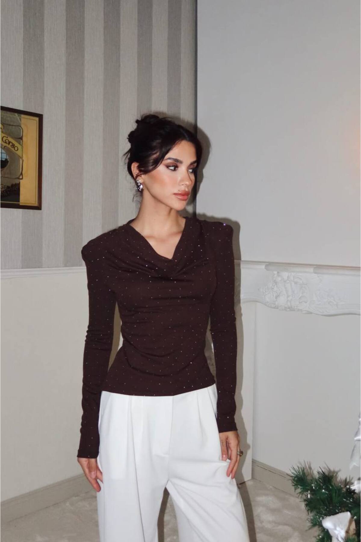 مشخصات فنی Taşlı Bel Detaylı Degaje Yaka Kadın Bluz