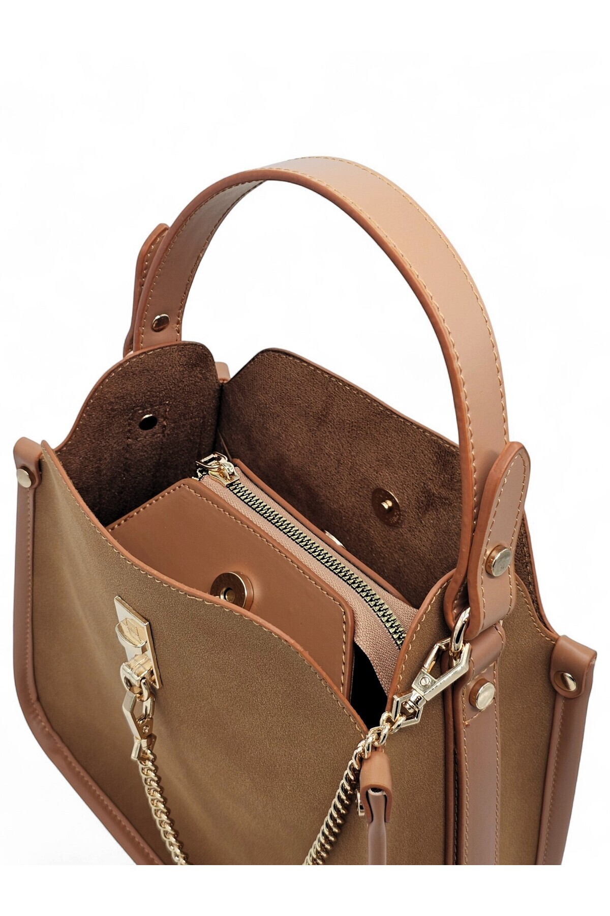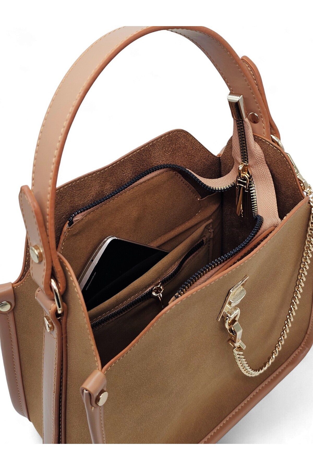 Taba Nubuk Zincir Aksesuar Detaylı El & Omuz Kadın Çantası Taba Nubuk Zincir Aksesuar Detaylı El & Omuz Kadın Çantası E-4575-nubuk تک سایز