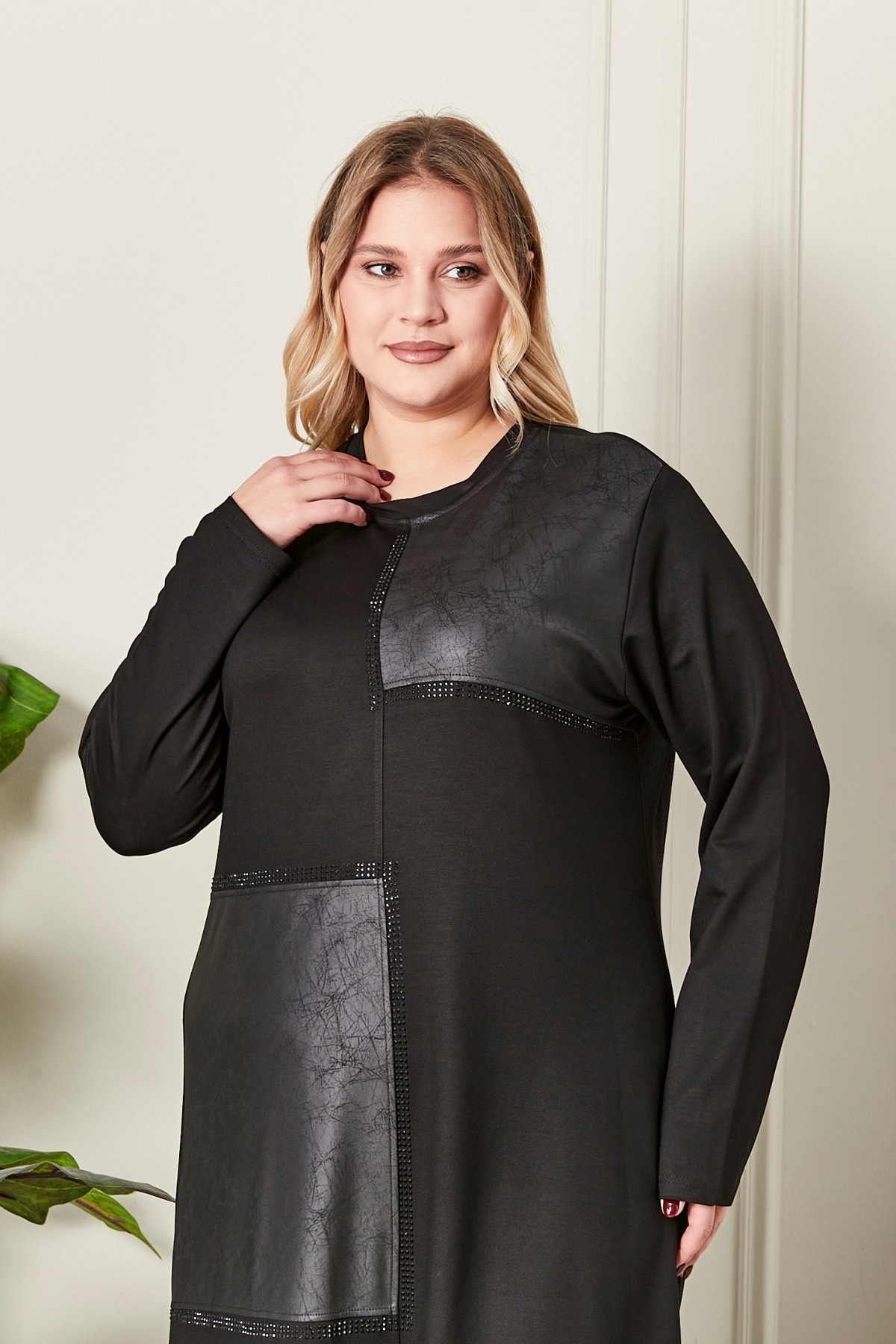 Kadın Büyük Beden Deri Detaylı Kristal Penye Elbise Kadın Büyük Beden Deri Detaylı Kristal Penye Elbise 9438SevimG1 2XL