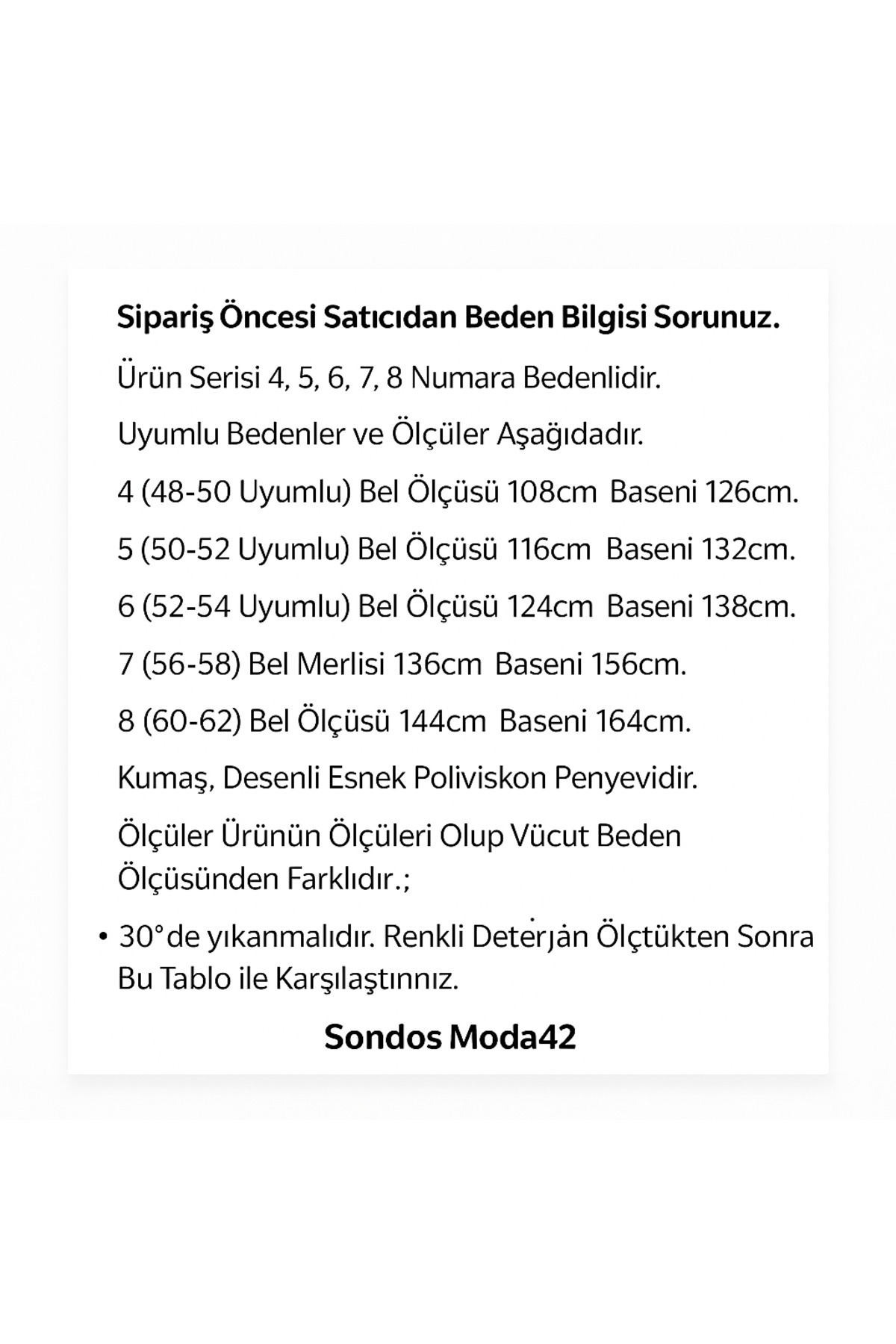 - Yıkama Talimatı : 30° de yıkanmalıdır. Renkli deterjan kullanılmalıdır. Çamaşır suyu leke çıkarıcı ve optik deterjan kullanmayınız.