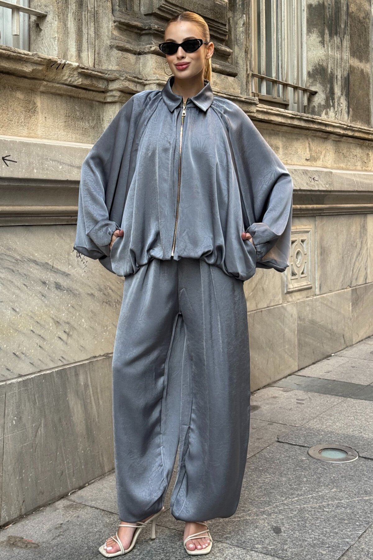 Polo Yaka Yarasa Kol Fermuar Kapamalı Ceket Ve Beli Lastlikli Pantolon Salaş Takım Polo Yaka Yarasa Kol Fermuar Kapamalı Ceket Ve Beli Lastlikli Pantolon Salaş Takım VS01209 تک سایز