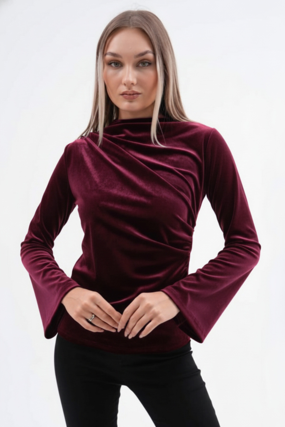 مشخصات فنی Kadife Balıkçı Yaka Büzgü Detaylı Bluz – Şık & Zarif