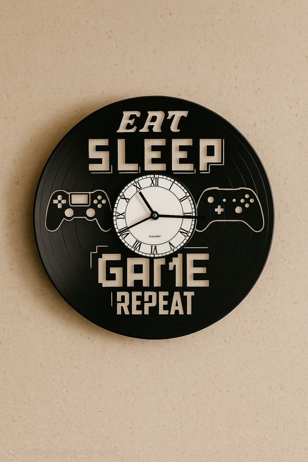 Eat Sleep Game Repeat Temalı El Yapımı Geri Dönüşüm Plak Duvar Saati Eat Sleep Game Repeat Temalı El Yapımı Geri Dönüşüm Plak Duvar Saati Plak003 تک سایز