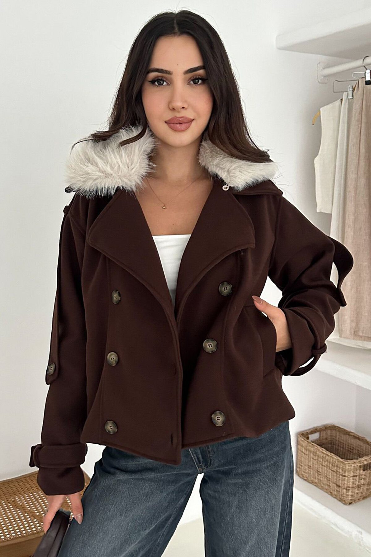 ALAÇATI STİLİ Kadın Kahverengi Düğmeli Kol Detaylı Kürk Yaka Kaşe Astarlı Kaban Vs01573 ALAÇATI STİLİ Kadın Kahverengi Düğmeli Kol Detaylı Kürk Yaka Kaşe Astarlı Kaban Vs01573 VS01573 L