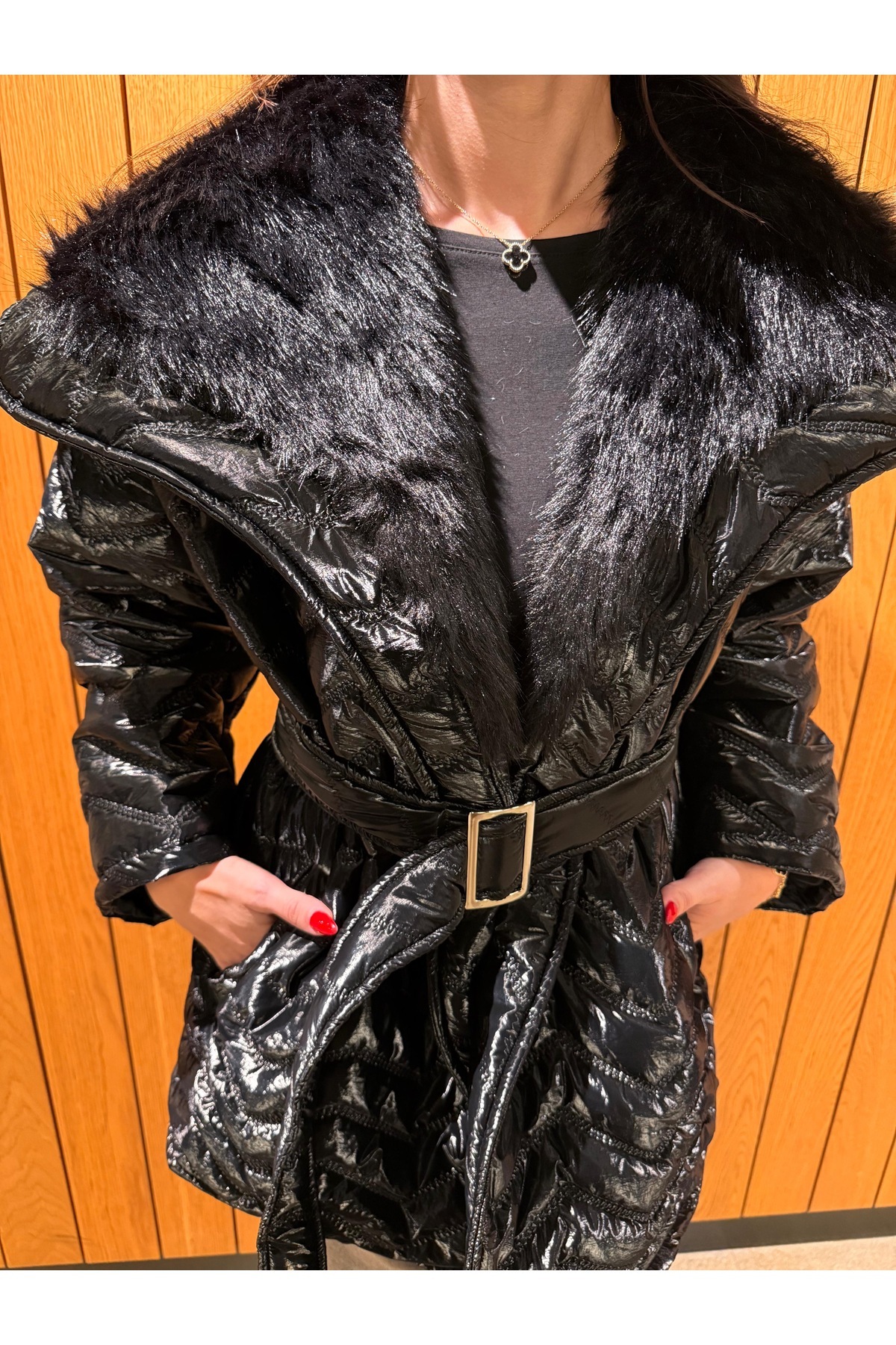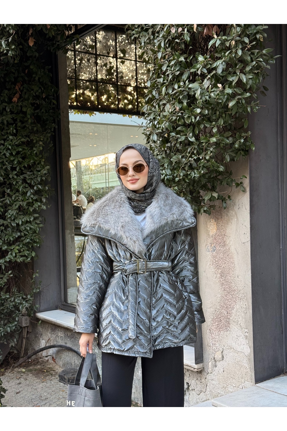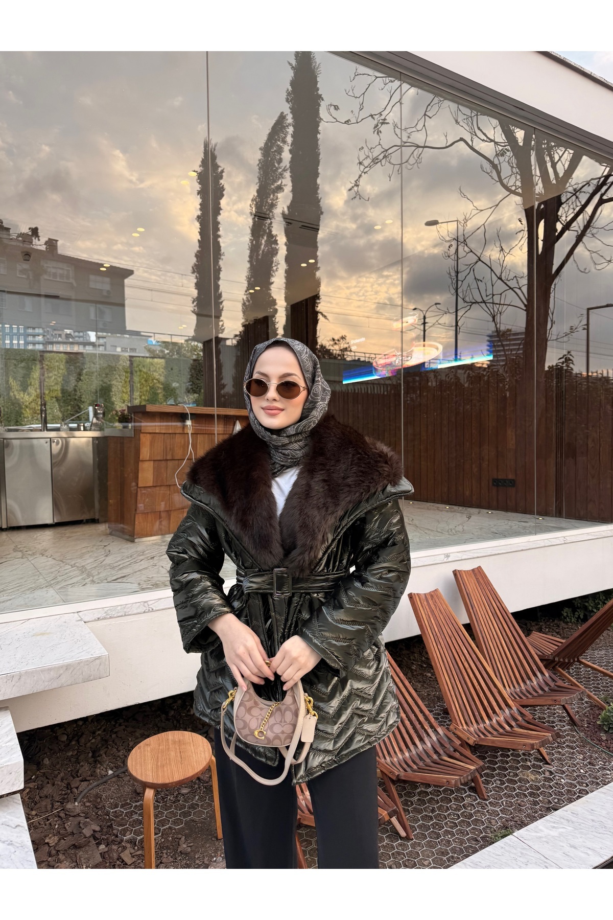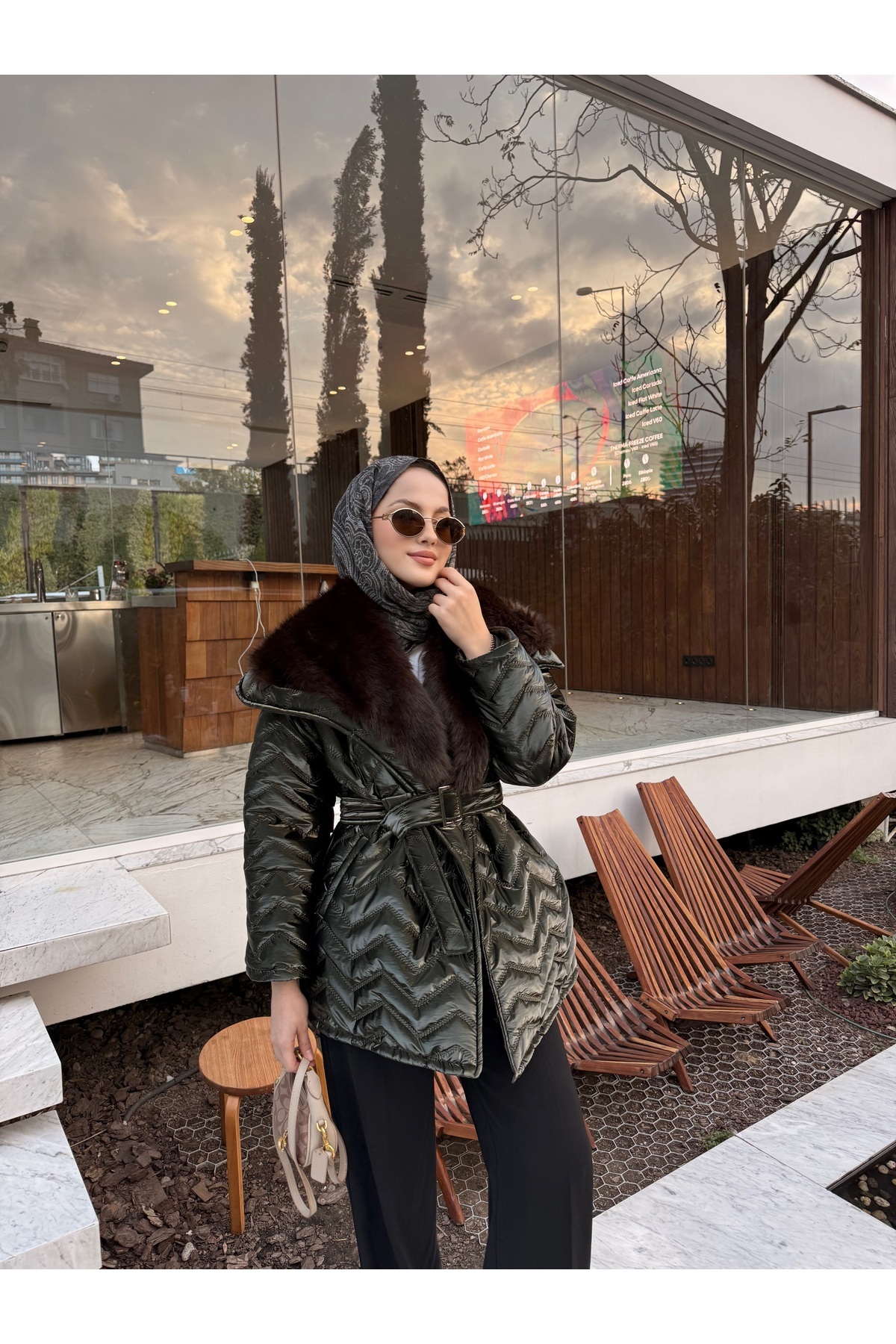 Kadın Yakası Kürk Detaylı Bel Bağlamalı Mont Koyu Yeşil Kadın Yakası Kürk Detaylı Bel Bağlamalı Mont Koyu Yeşil 232-6167 Standart