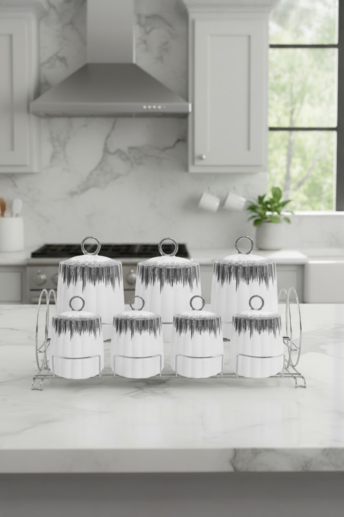 Enzo Gümüş Detaylı Metal Standlı 7'li Porselen Baharat Takımı Enzo Gümüş Detaylı Metal Standlı 7'li Porselen Baharat Takımı VP209 تک سایز