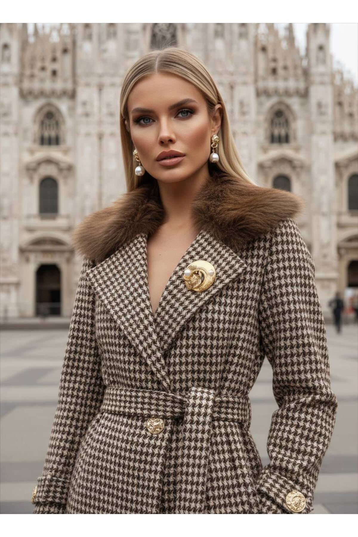 İtal Tüvit Kumaş Broş Detaylı Kürklü Kuşaklı Özel Tasarım Kuşaklı Astarlı Maxi Kaban İtal Tüvit Kumaş Broş Detaylı Kürklü Kuşaklı Özel Tasarım Kuşaklı Astarlı Maxi Kaban 2626KBN 2XL