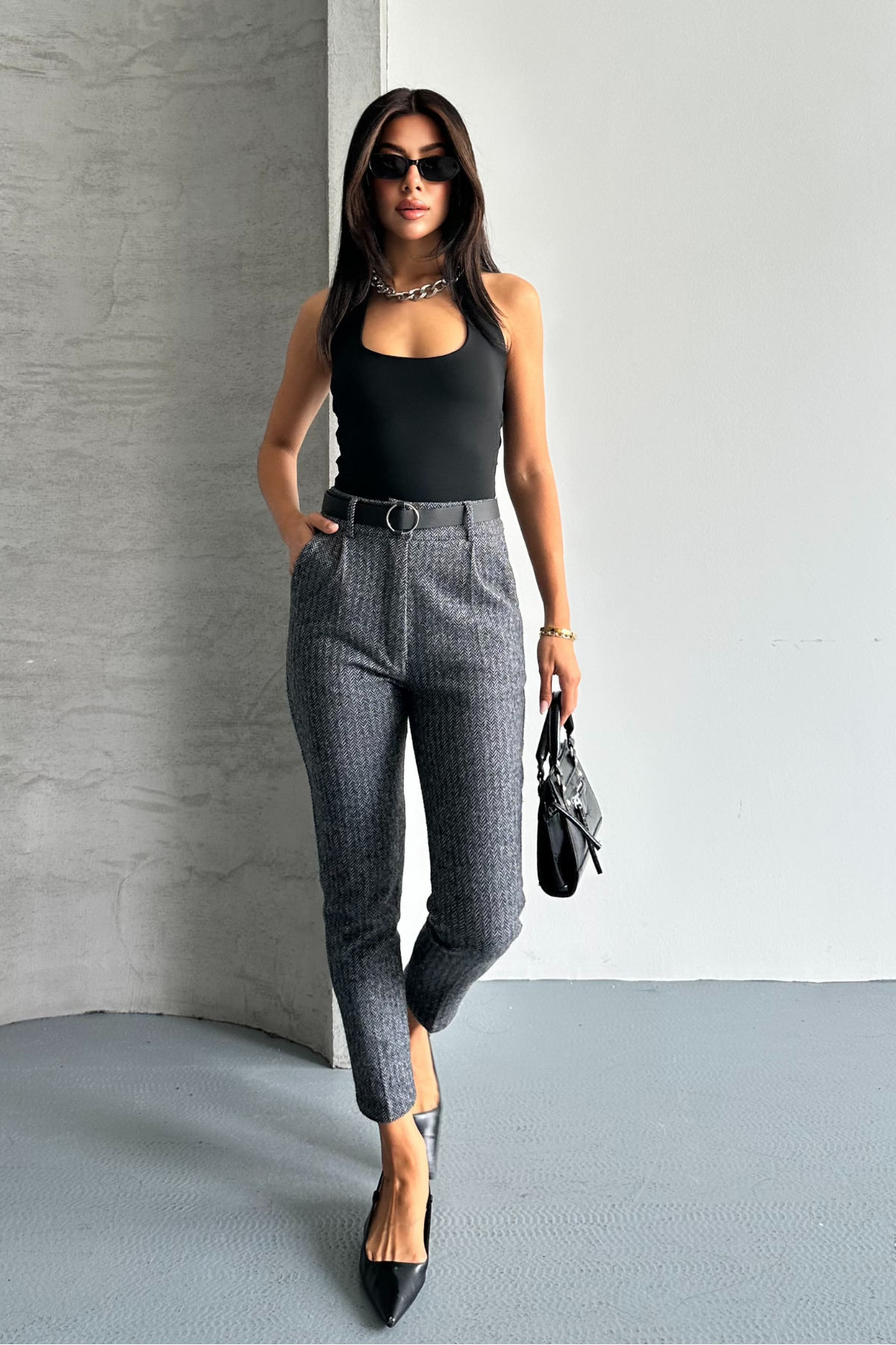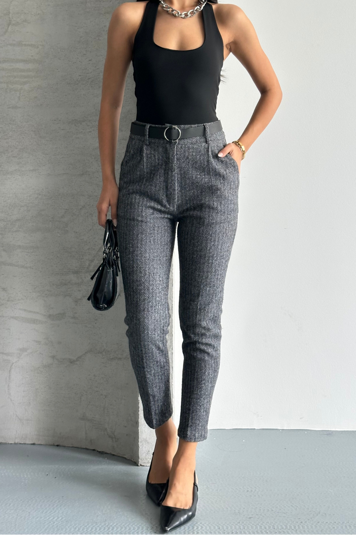 Kadın Desenli Dar Paça Cepli Kemerli Kaşe Pantolon Kadın Desenli Dar Paça Cepli Kemerli Kaşe Pantolon 1887 2XL