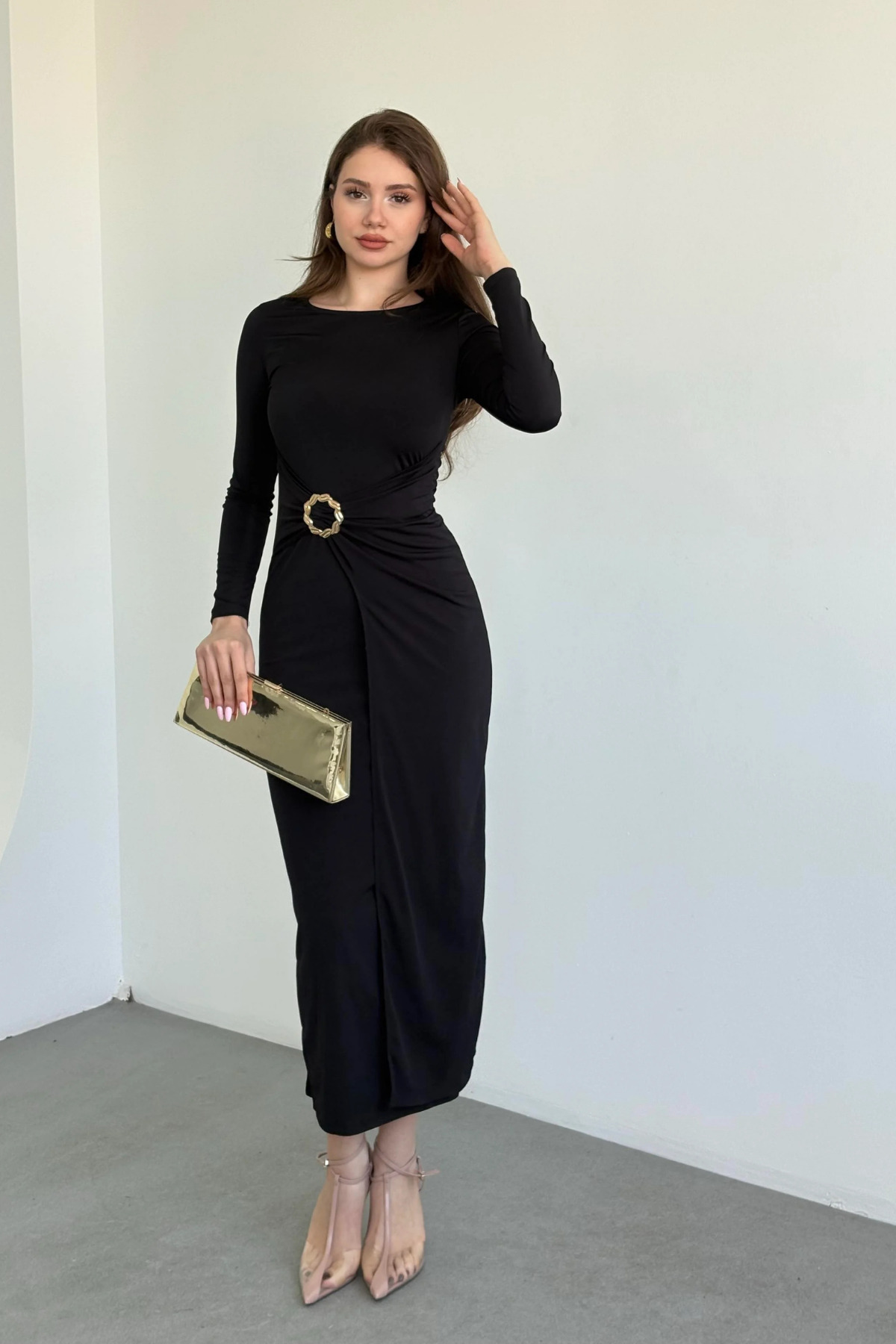 Bisiklet Yaka Sandy Kumaş Gold Aksesuarlı Uzun Elbise Bisiklet Yaka Sandy Kumaş Gold Aksesuarlı Uzun Elbise GLS01 L