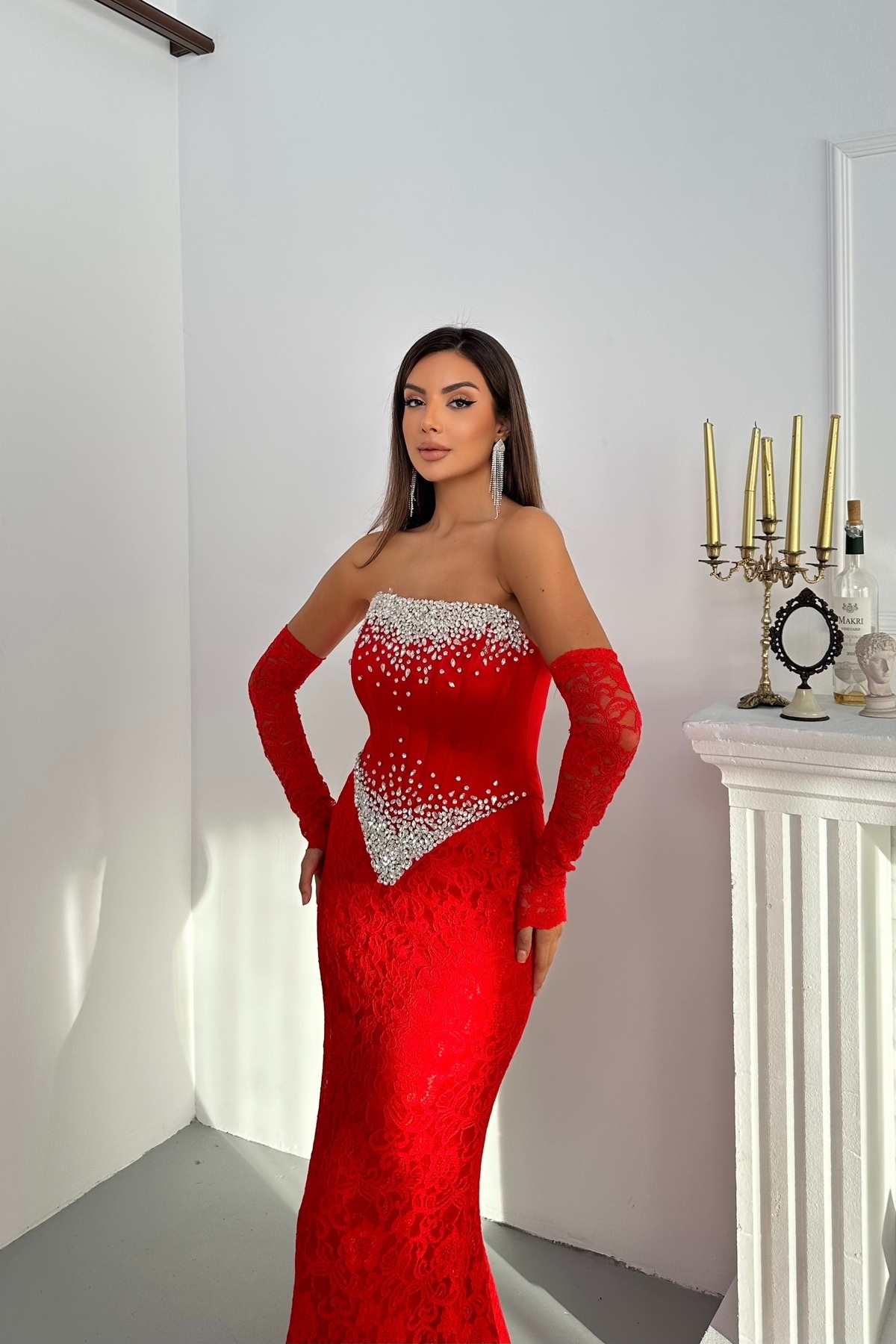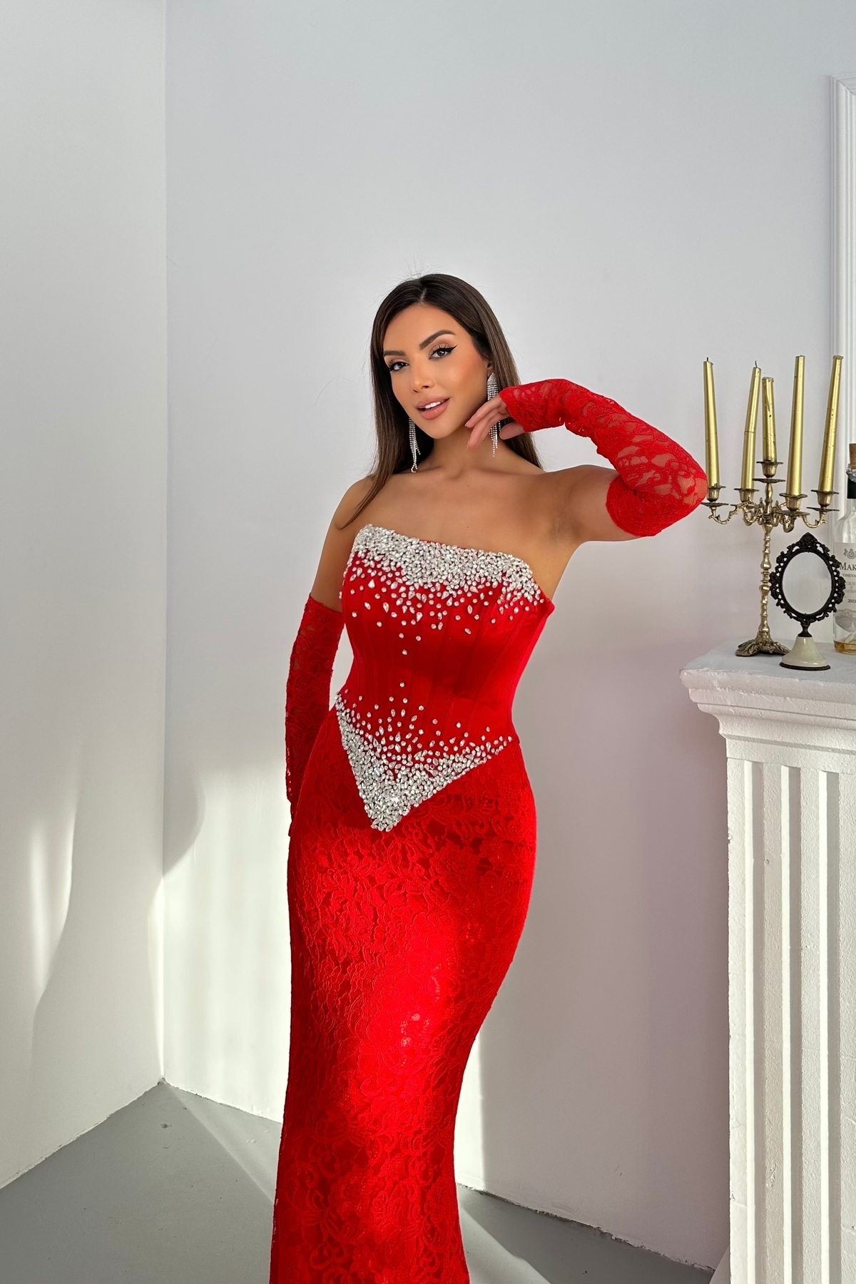 Taş Detaylı Dantel Ve Satenli Kollu Şık Tasarım Abiye Elbise Dar Kalıp Taş Detaylı Dantel Ve Satenli Kollu Şık Tasarım Abiye Elbise Dar Kalıp 3073 44