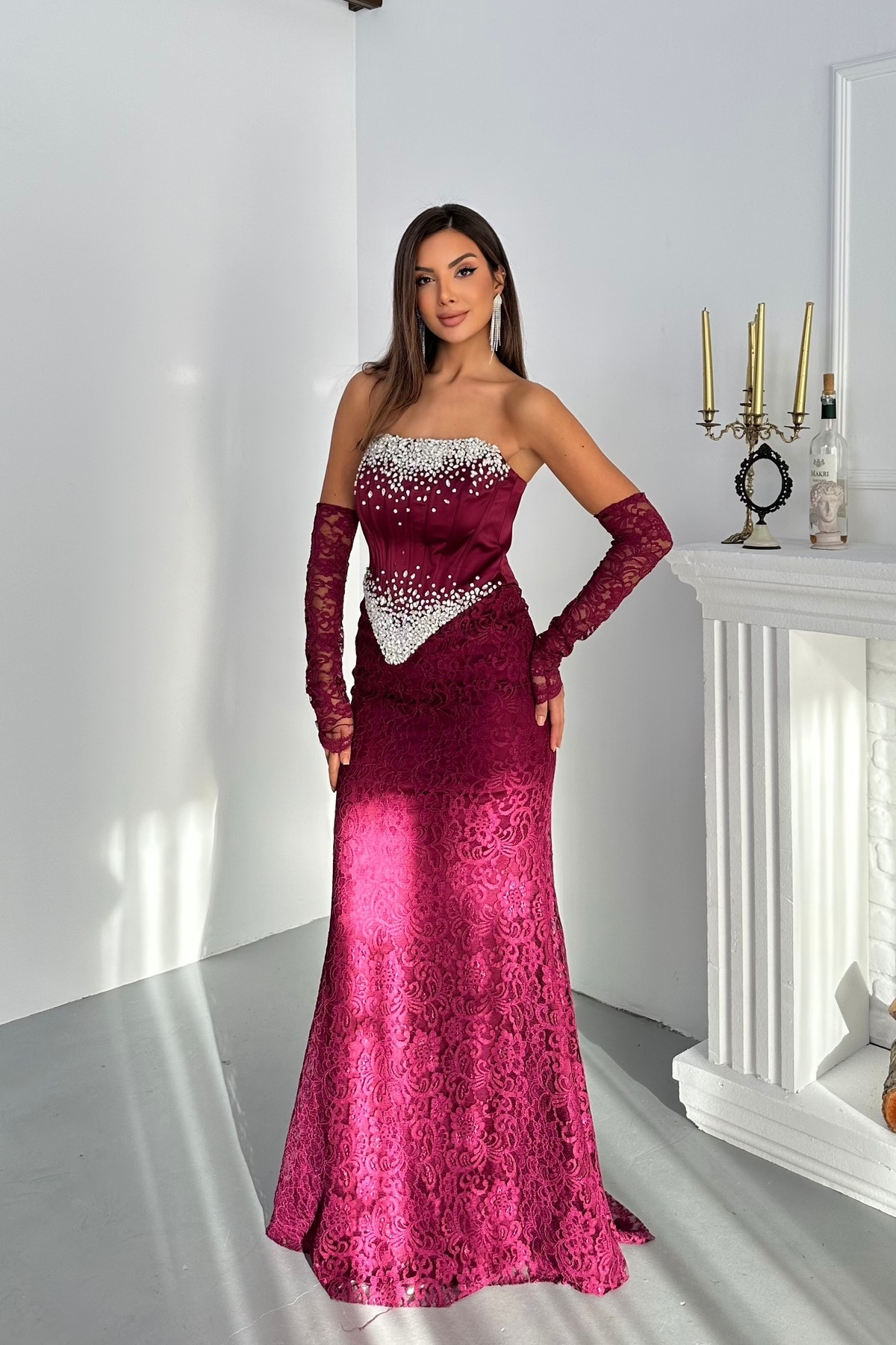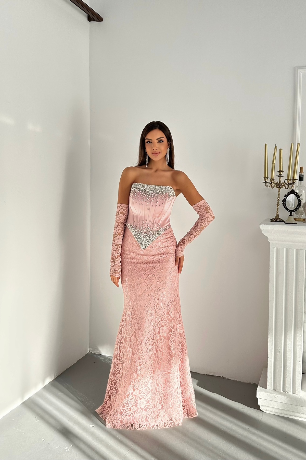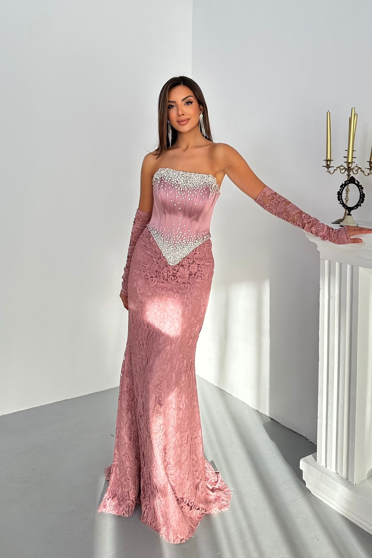 Taş Detaylı Dantel Ve Satenli Kollu Şık Tasarım Abiye Elbise Dar Kalıp Taş Detaylı Dantel Ve Satenli Kollu Şık Tasarım Abiye Elbise Dar Kalıp 3073 44