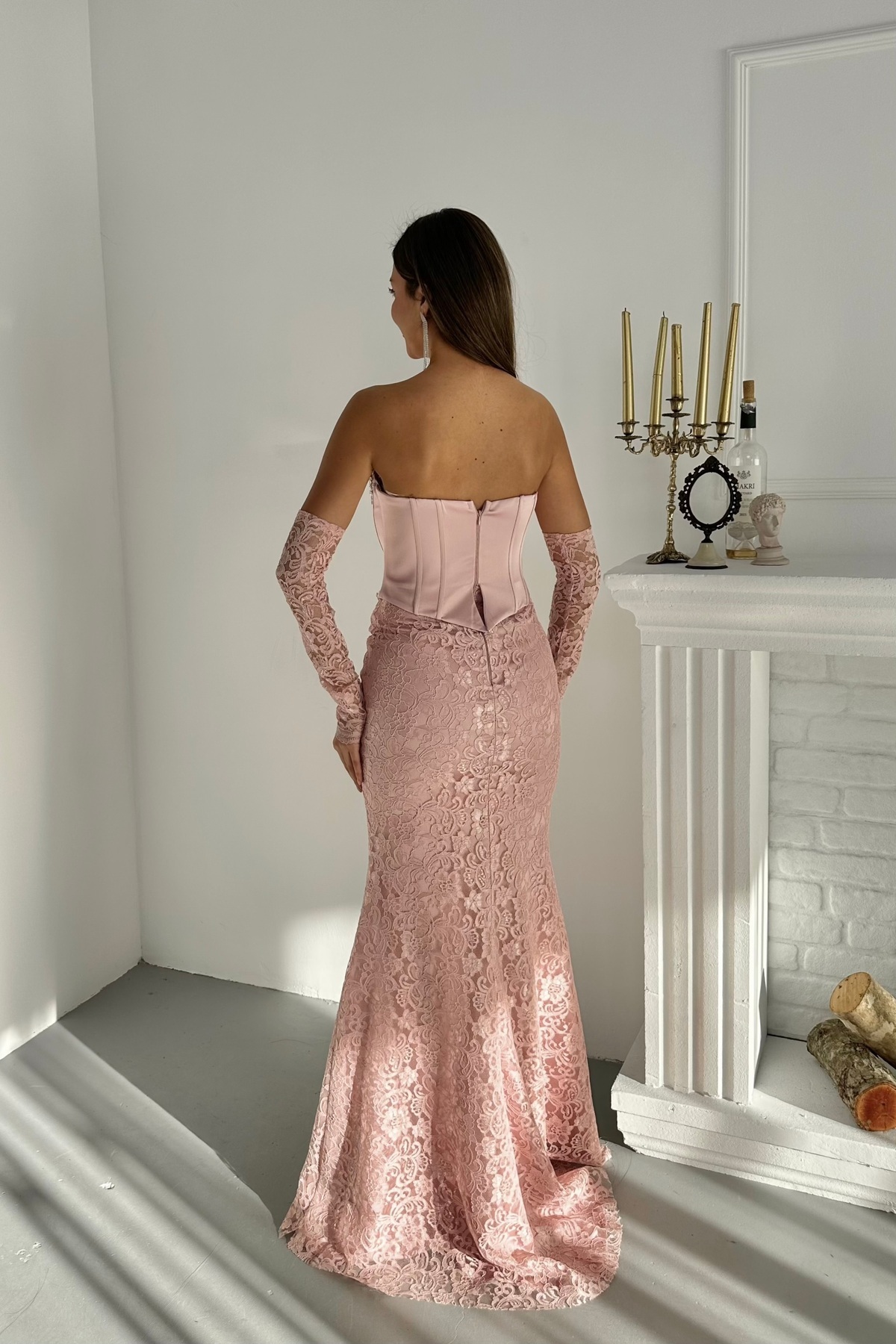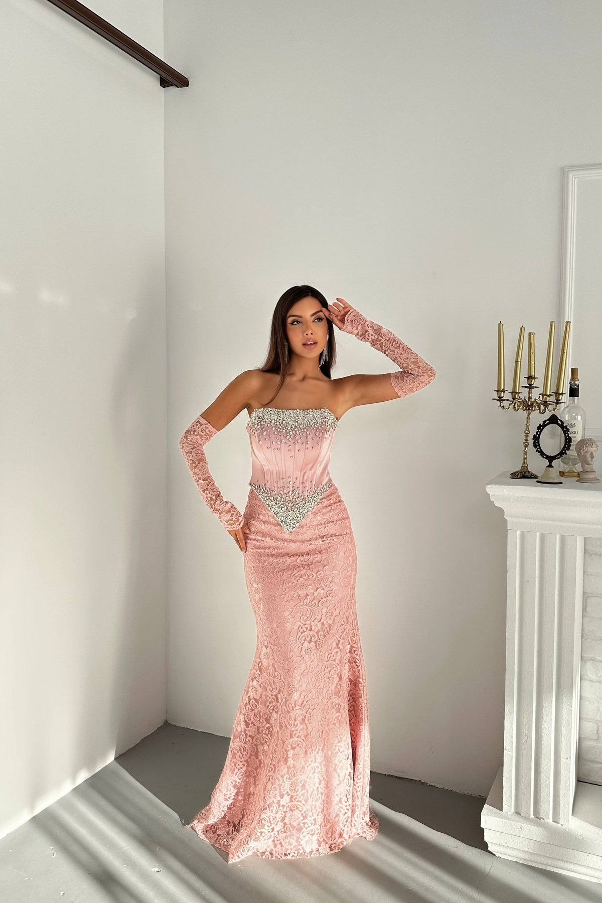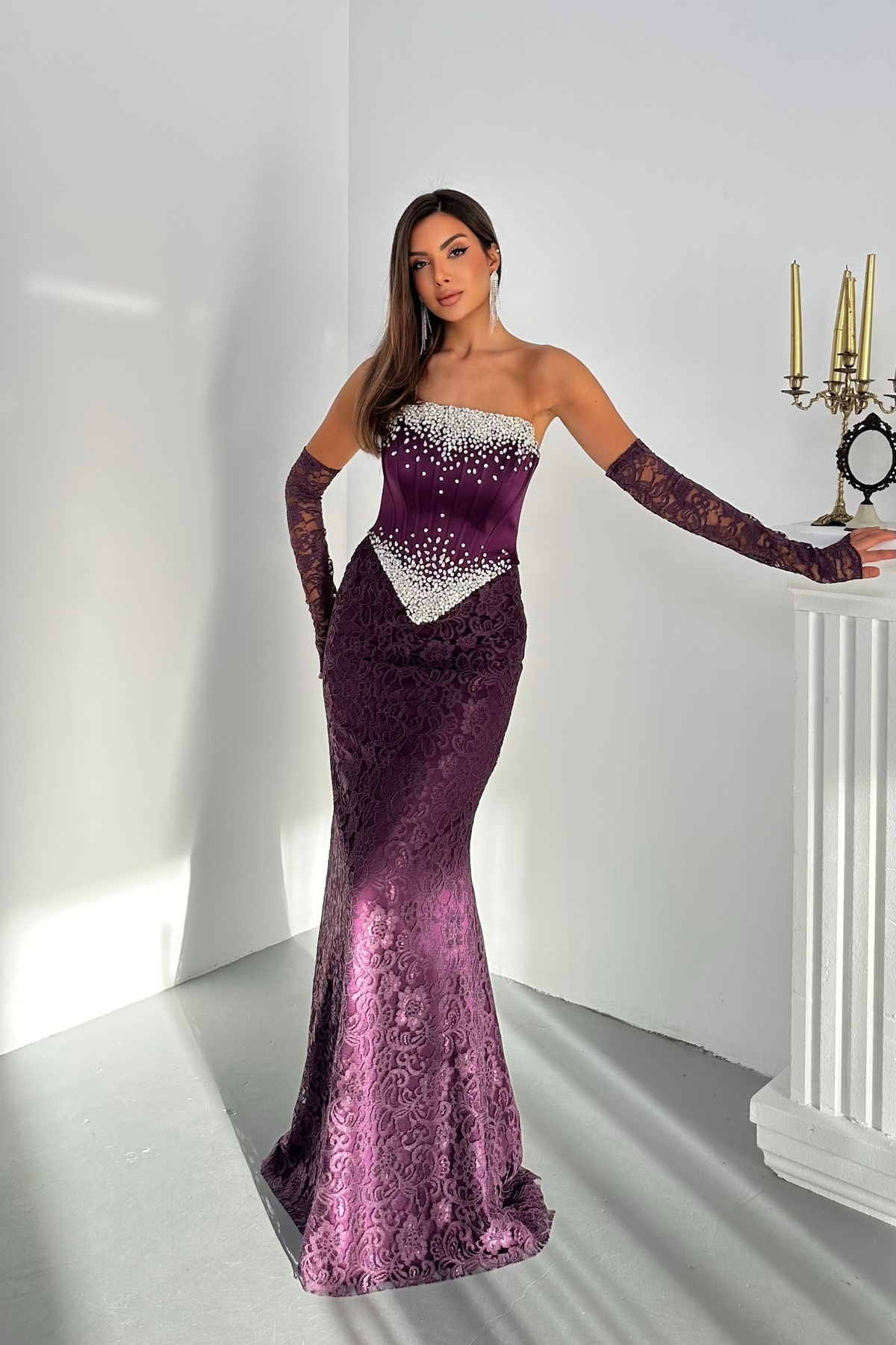 Taş Detaylı Dantel Ve Satenli Kollu Şık Tasarım Abiye Elbise Dar Kalıp Taş Detaylı Dantel Ve Satenli Kollu Şık Tasarım Abiye Elbise Dar Kalıp 3073 44