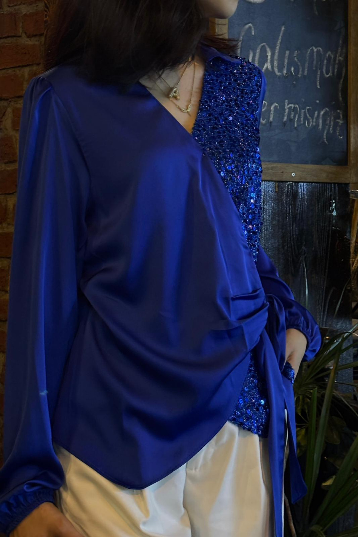 KADIN V Yaka Kolu Lastikli Yarı Payetli Yandan Bağlamalı Dar Kesim Saten Bluz KADIN V Yaka Kolu Lastikli Yarı Payetli Yandan Bağlamalı Dar Kesim Saten Bluz SUN40 46