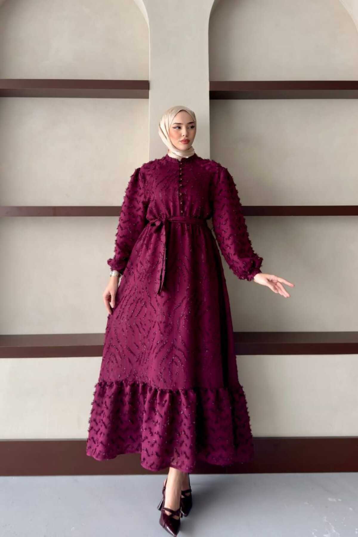 Hakim Yaka Yarım Düğmeli Üstü Sim Tüy Desenli Balon Kol Belden Kuşaklı Astarlı Tesettür Elbise Hakim Yaka Yarım Düğmeli Üstü Sim Tüy Desenli Balon Kol Belden Kuşaklı Astarlı Tesettür Elbise MY-739556 40-42