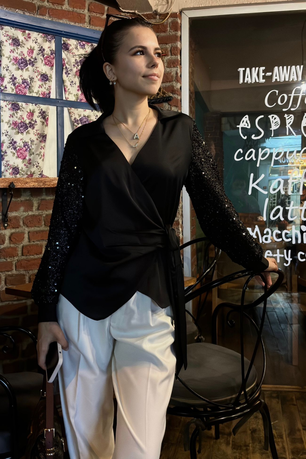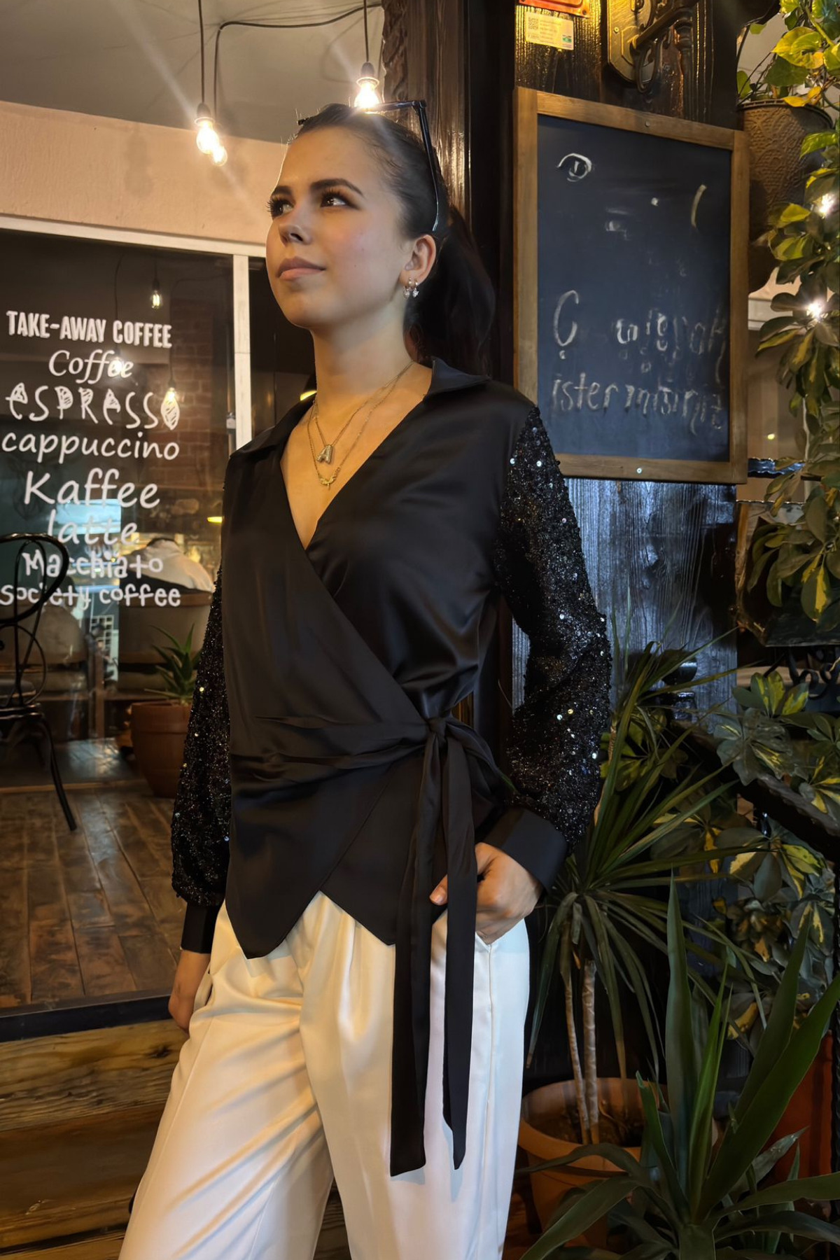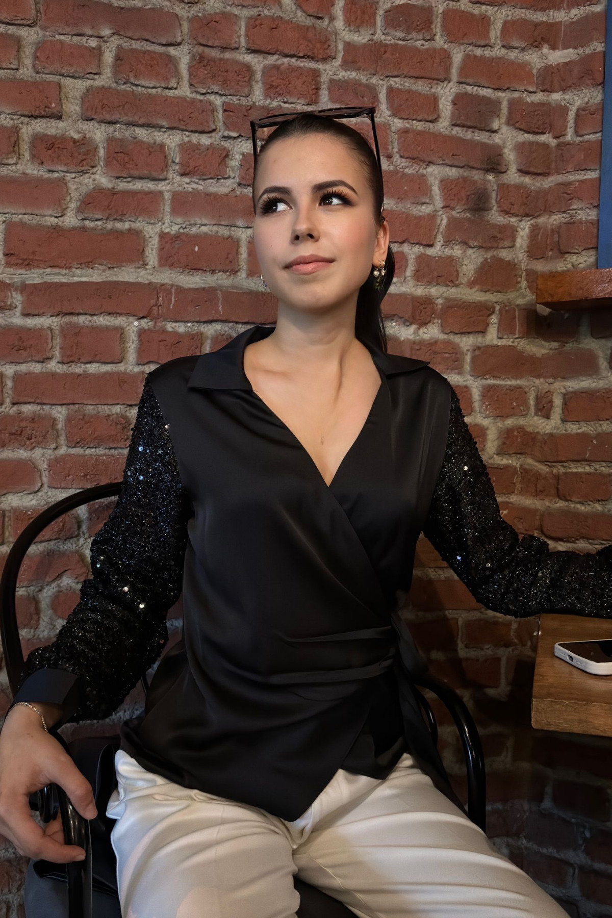 KADIN V Yaka Kolu Payetli Yandan Bağlamalı Dar Kesim Saten Bluz KADIN V Yaka Kolu Payetli Yandan Bağlamalı Dar Kesim Saten Bluz SUN219 46