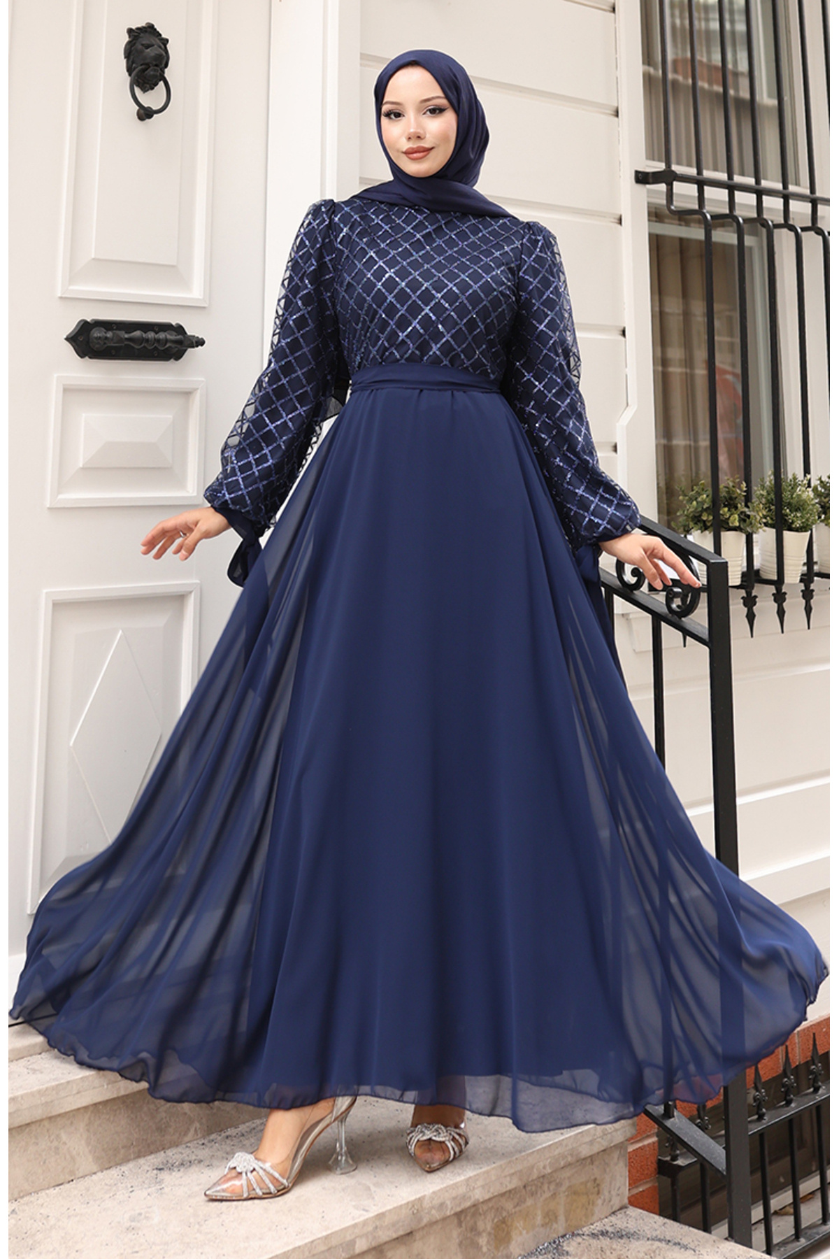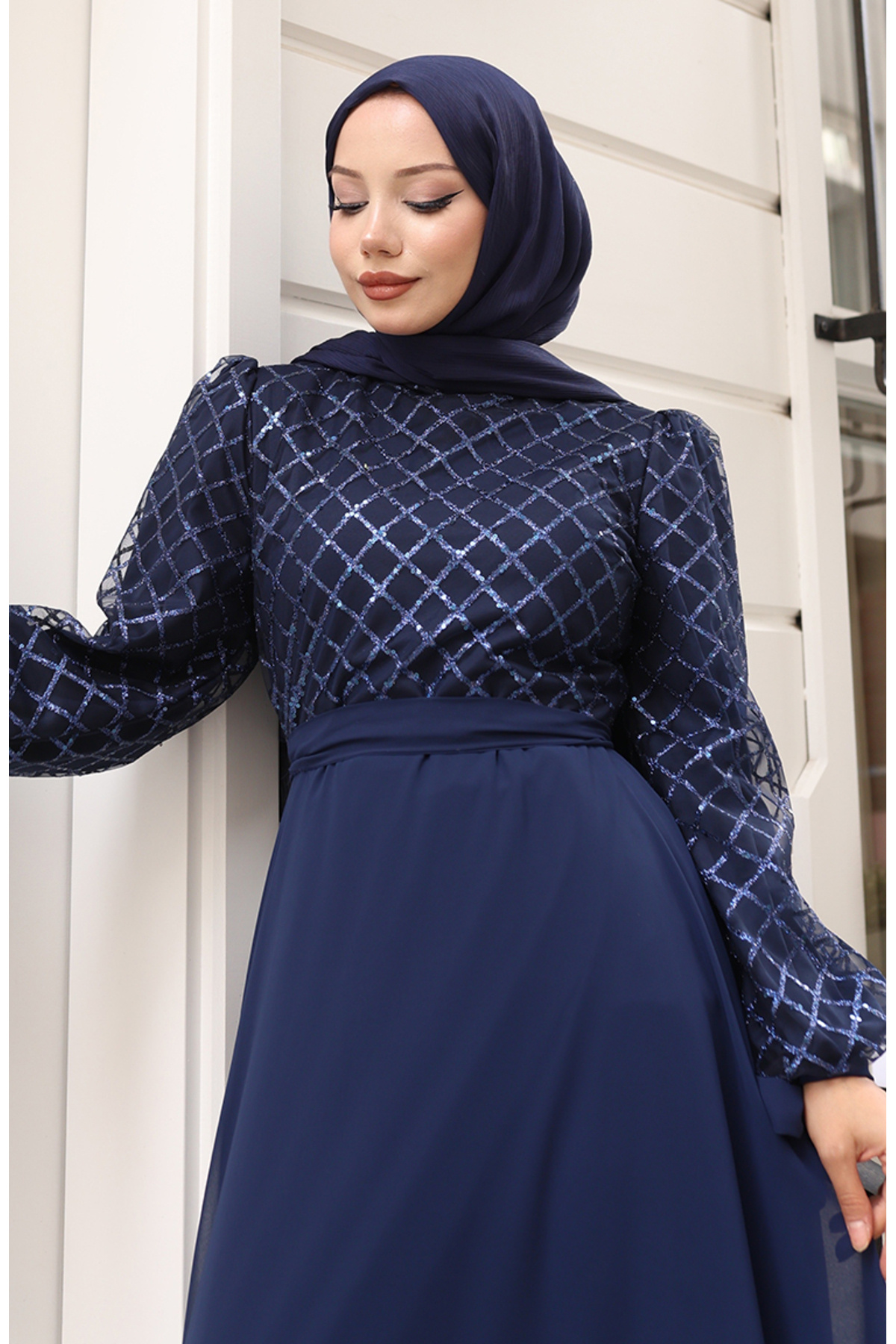 Pullu Kuşaklı Şifon Abiye Elbise 5617-02 Lacivert Pullu Kuşaklı Şifon Abiye Elbise 5617-02 Lacivert KSNENDRN5617 52