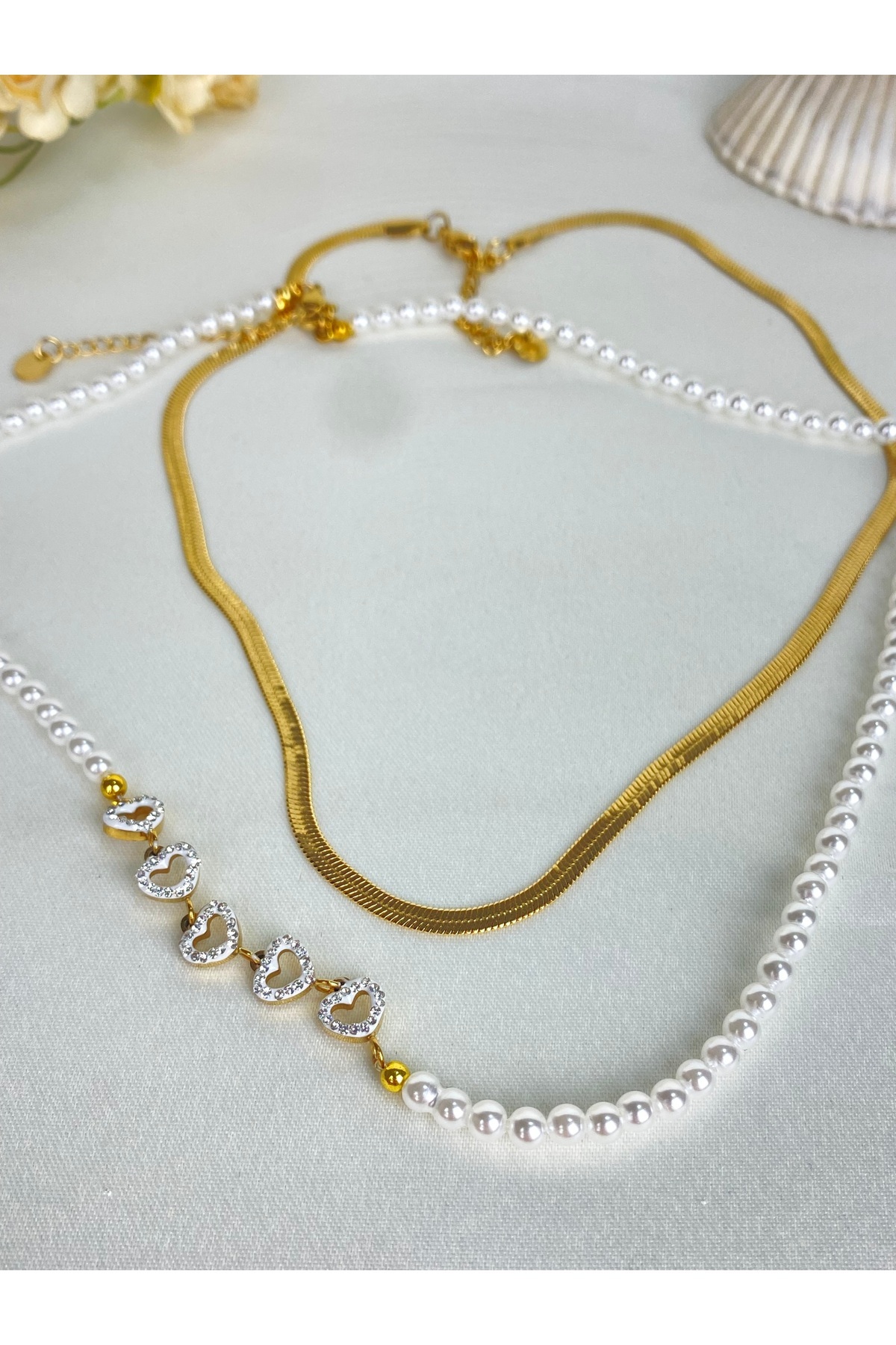 İncili Minimal Kalp Detaylı İtalyan Zincirli Kolye Kombini 2 Li Kolye Seti Gold Kaplama İncili Minimal Kalp Detaylı İtalyan Zincirli Kolye Kombini 2 Li Kolye Seti Gold Kaplama Jew1024 - Steel Necklace تک سایز