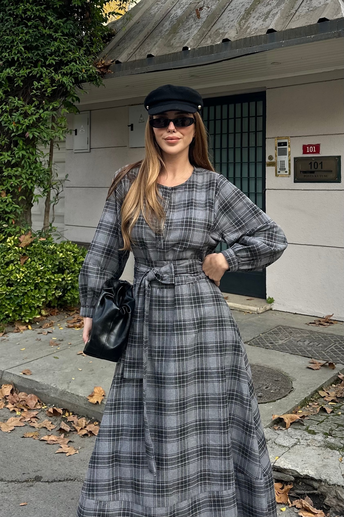 Gri Ekoseli Kuşaklı Uzun Elbise - 1235 Gri Ekoseli Kuşaklı Uzun Elbise - 1235 950-MSY-1235 L