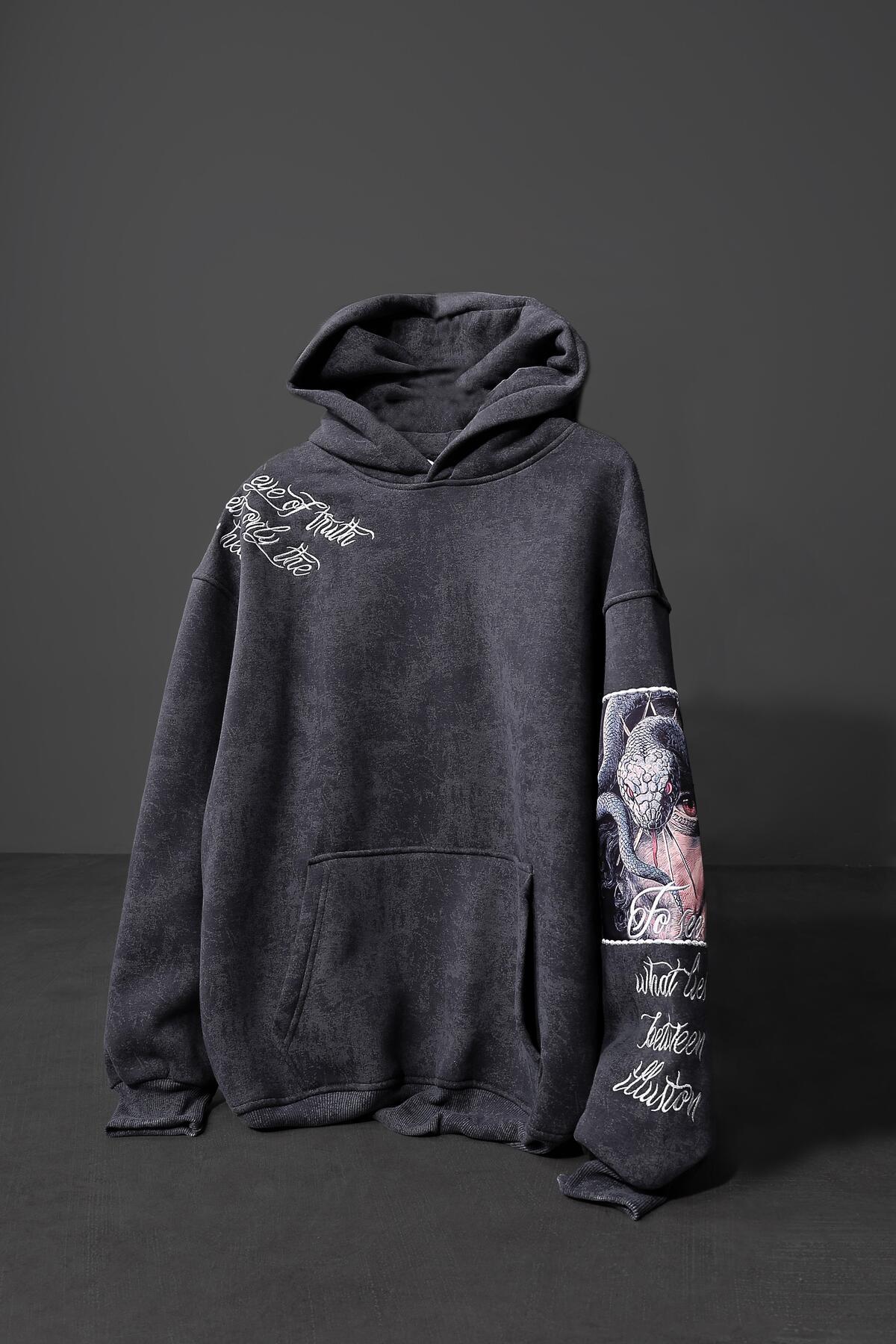 Erkek Siyah İllusion Nakışlı Patchli Yıkamalı Oversize Kapüşonlu Sweatshirt Erkek Siyah İllusion Nakışlı Patchli Yıkamalı Oversize Kapüşonlu Sweatshirt S5642 XL
