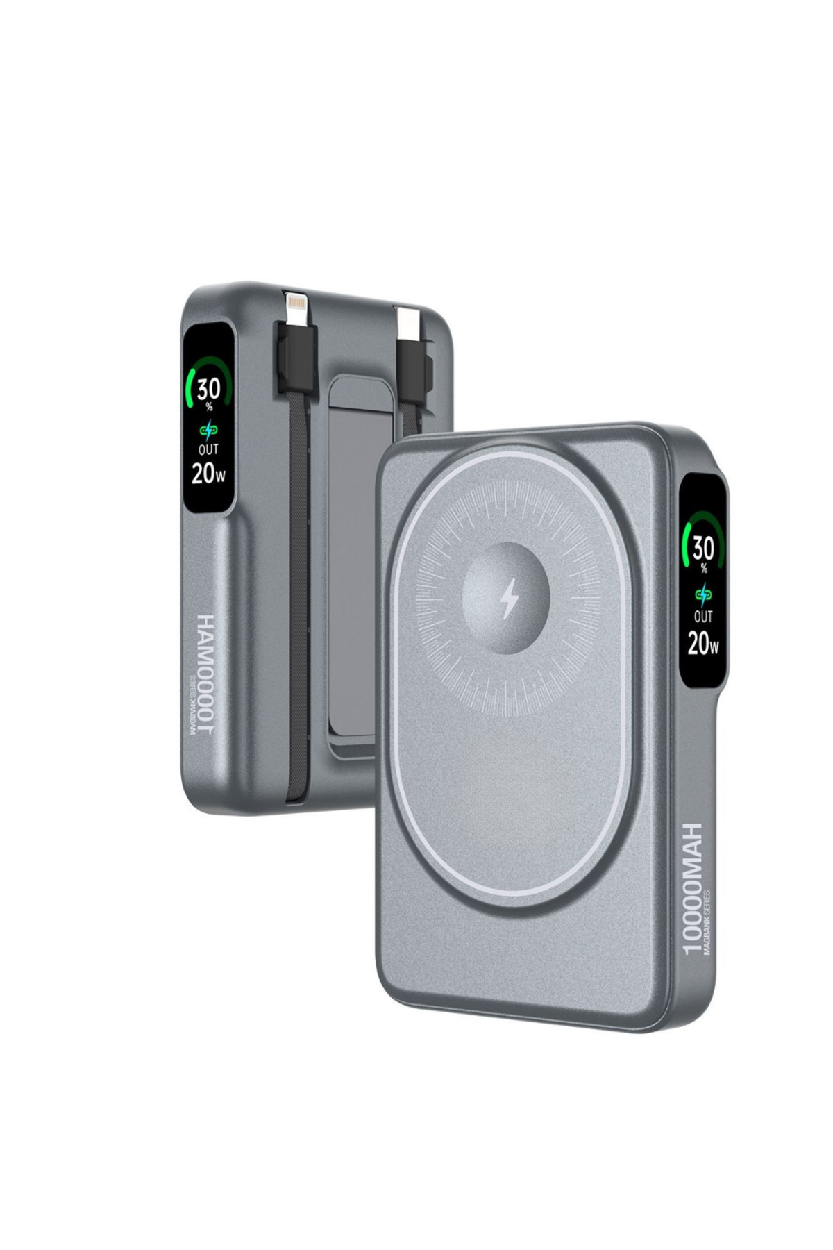 10000mAh Kablosuz MagSafe Powerbank 15W Hızlı Şarj Dahili Lightning & Type-C kablo STAND METALİK GRİ 10000mAh Kablosuz MagSafe Powerbank 15W Hızlı Şarj Dahili Lightning & Type-C kablo STAND METALİK GRİ brawi 10000 mag تک سایز