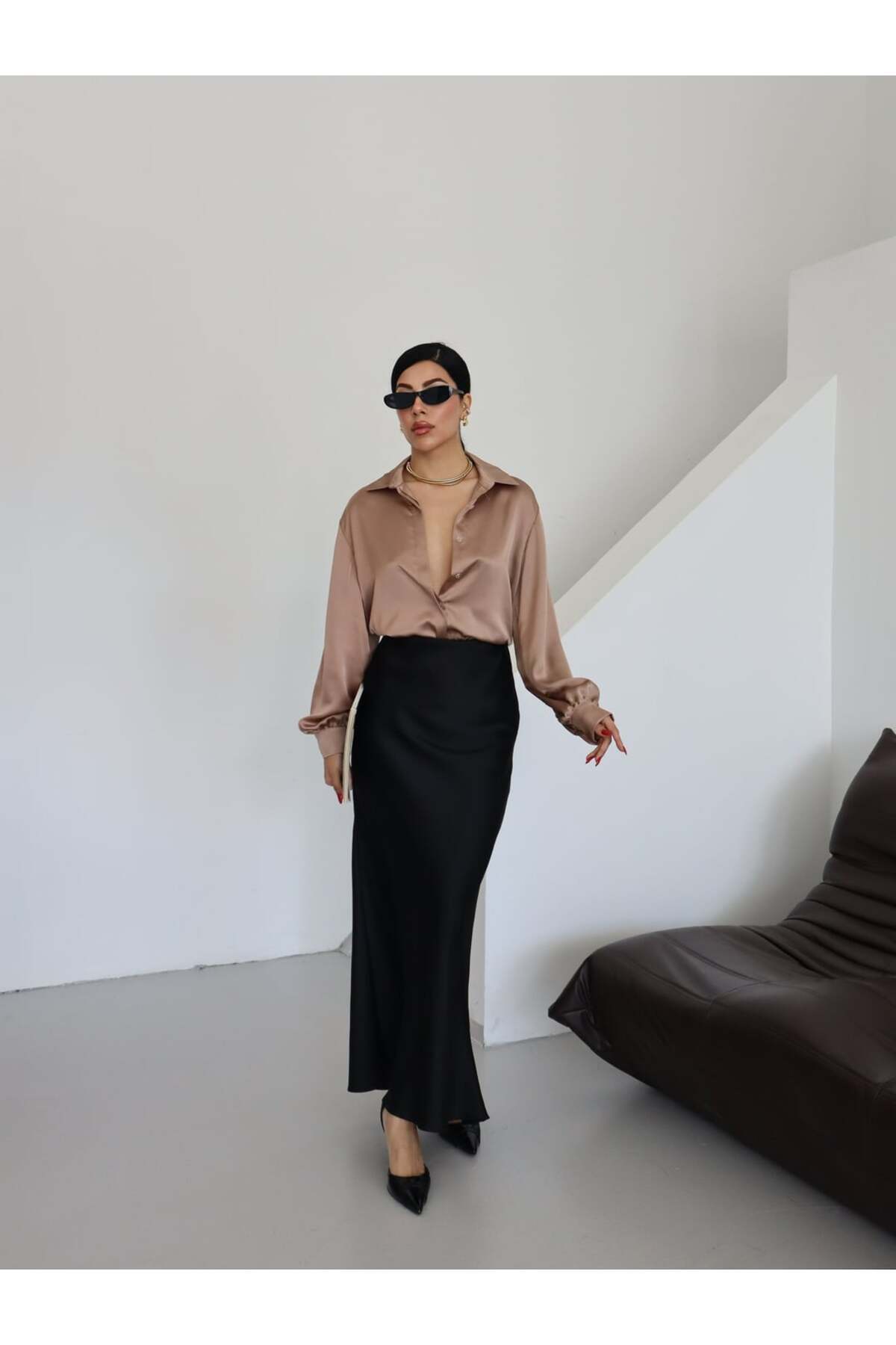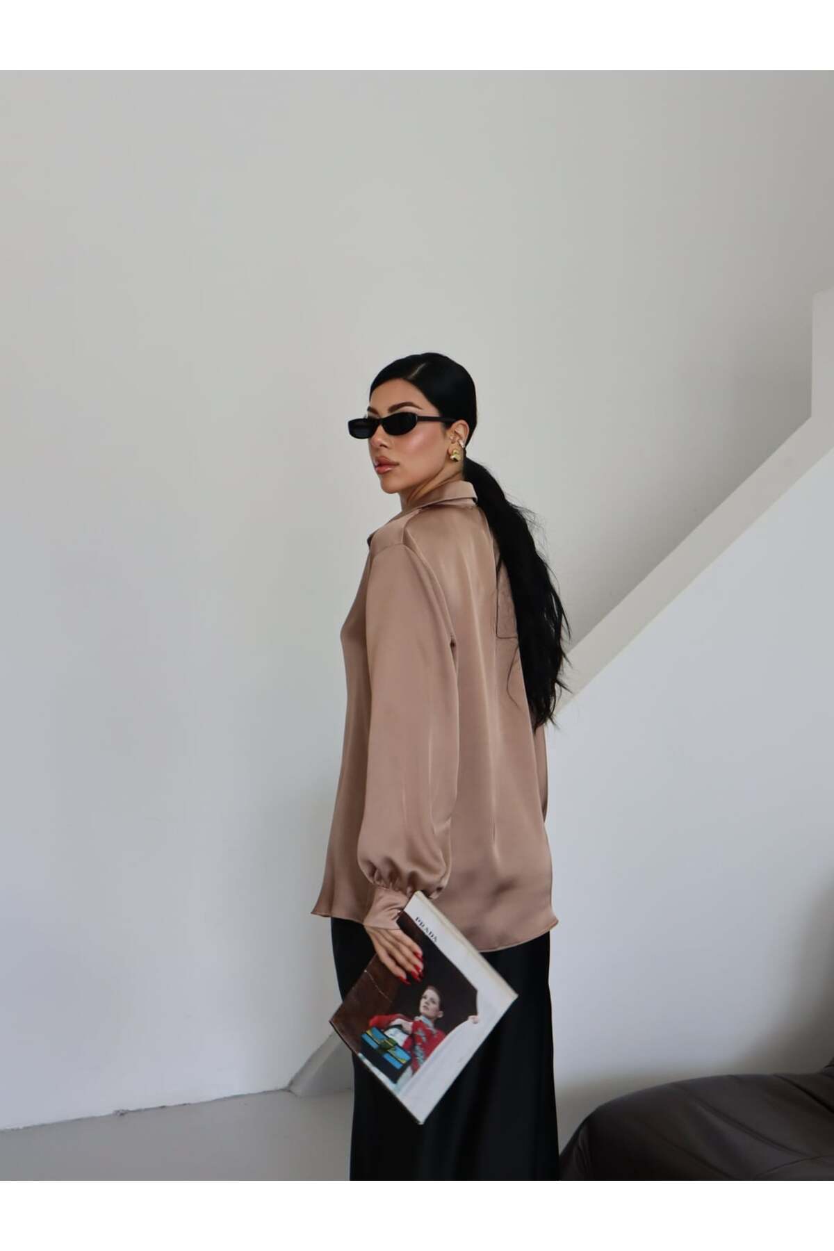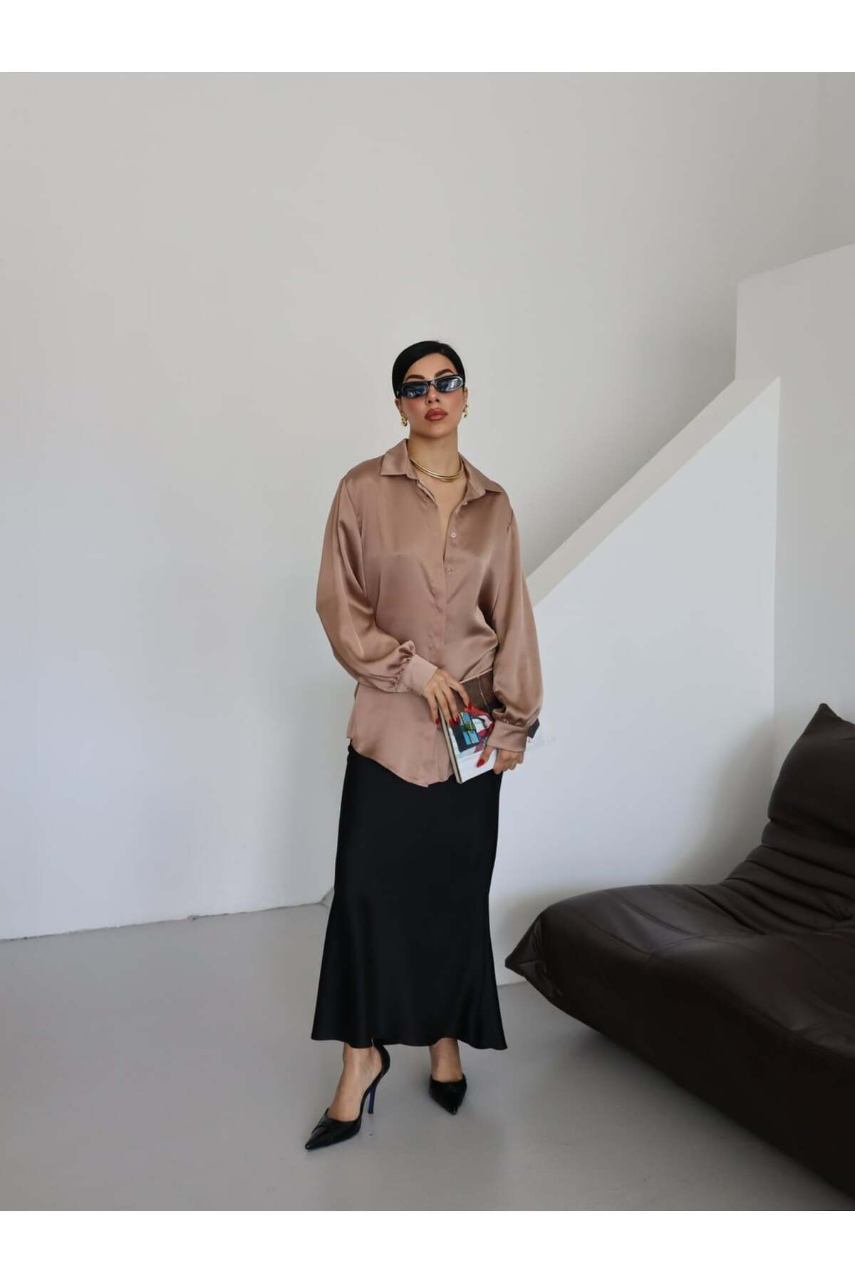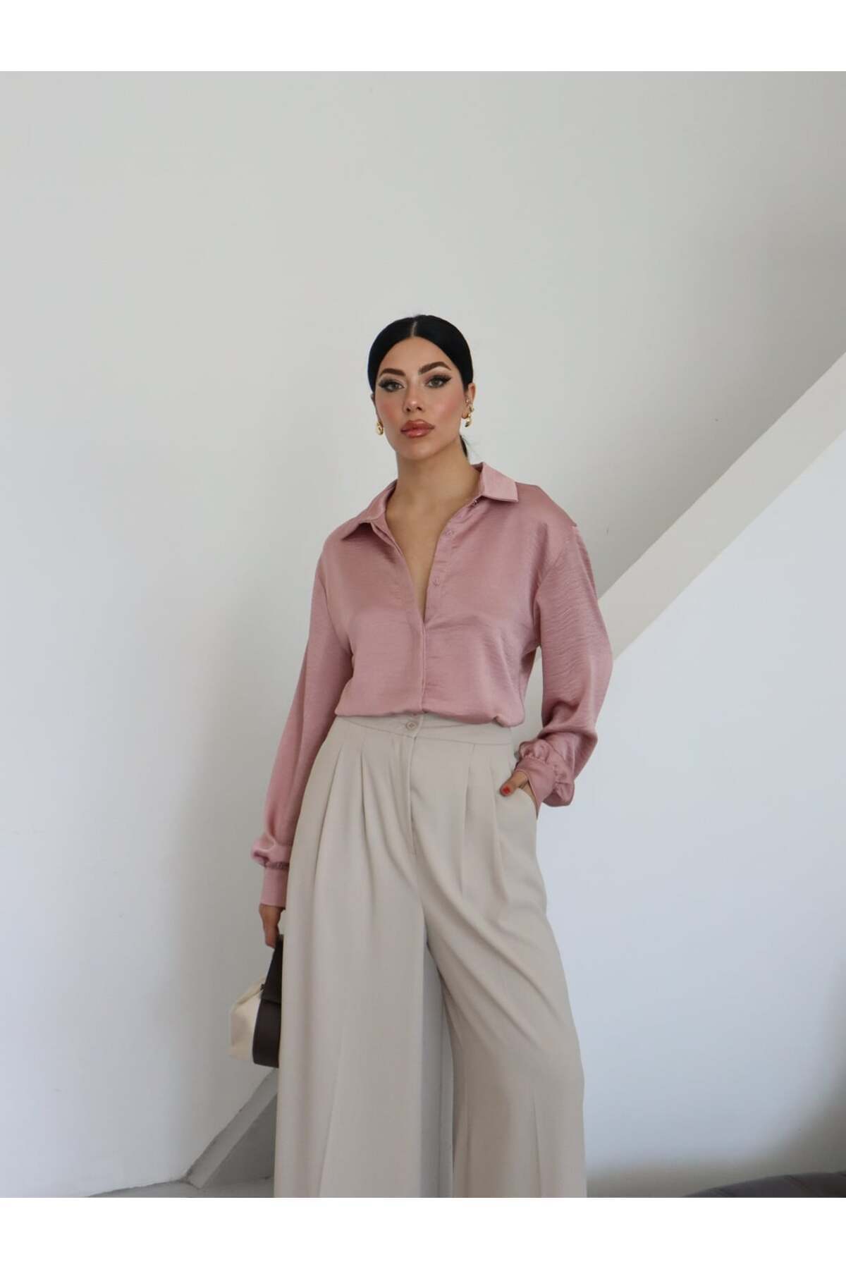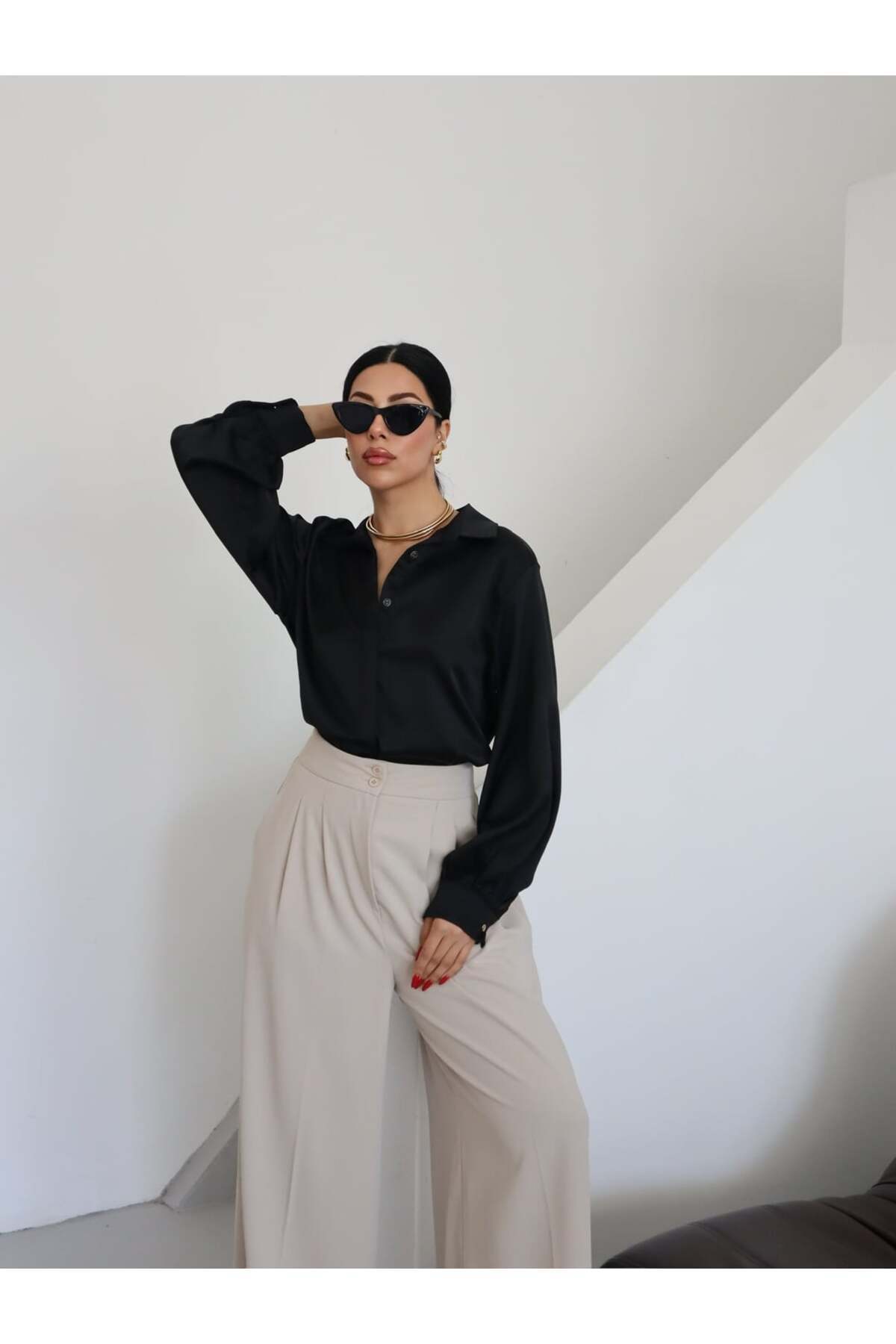 Kadın Düz Klasik Dokulu Saten Yakalı Gömlek Kadın Düz Klasik Dokulu Saten Yakalı Gömlek 25SS0029 46