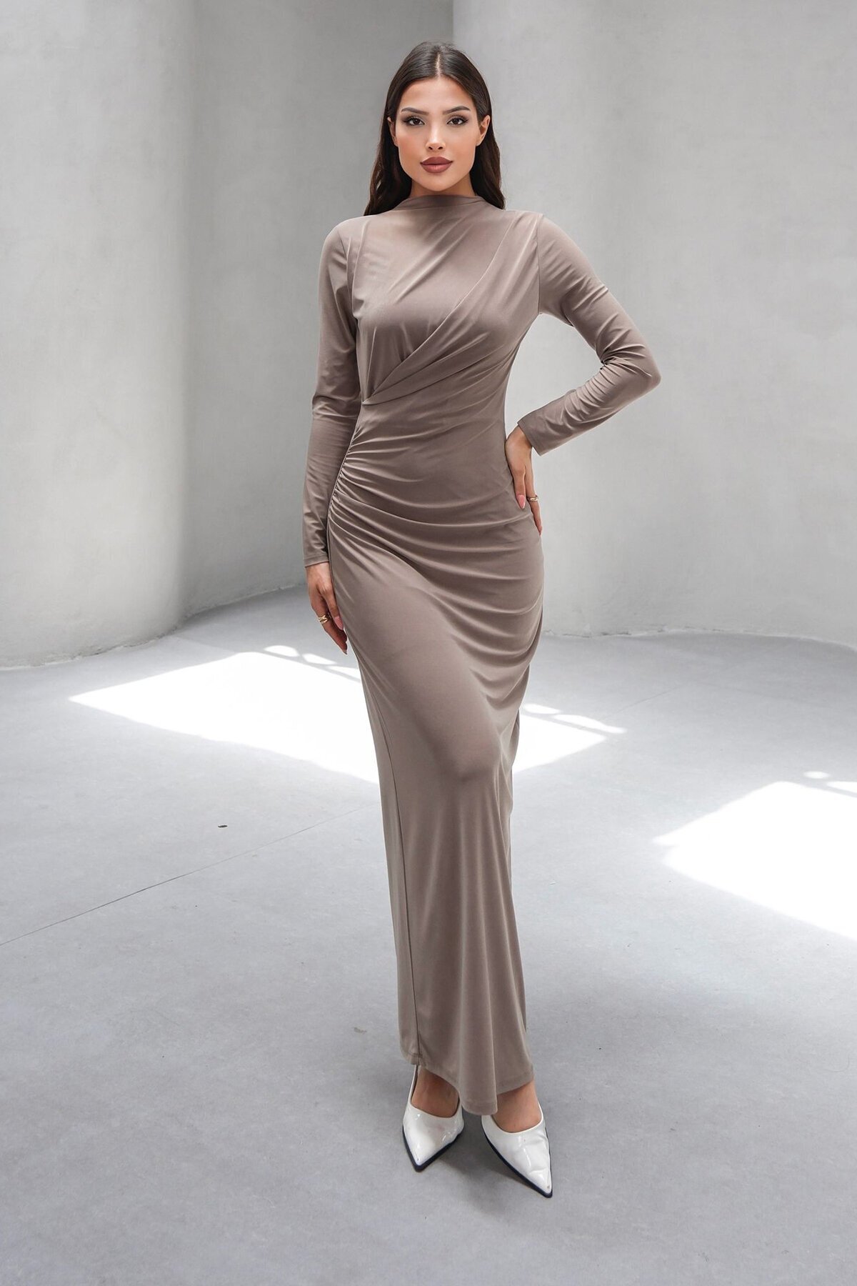 ALAÇATI STİLİ Kadın Simli Gri Uzun Kollu V Yaka Dekolteli Drapeli Yırtmaçlı Maxi Elbise Vs01598 ALAÇATI STİLİ Kadın Simli Gri Uzun Kollu V Yaka Dekolteli Drapeli Yırtmaçlı Maxi Elbise Vs01598 VS01598 XL