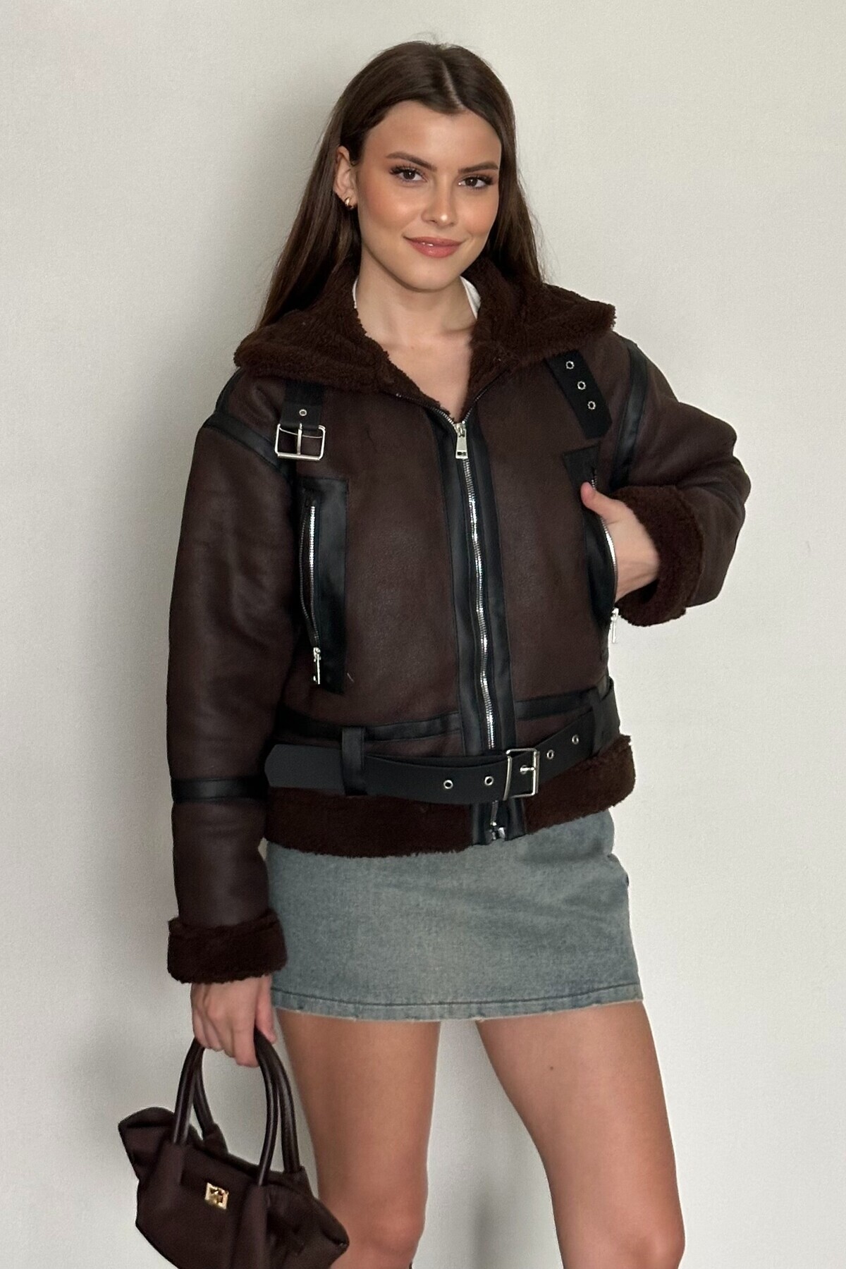 Kadın İçi Kürk Detaylı Kemerli Deri Mont - Kışlık Biker Peluş Astarlı Deri Ceket Kadın İçi Kürk Detaylı Kemerli Deri Mont - Kışlık Biker Peluş Astarlı Deri Ceket ma-aviator029 L