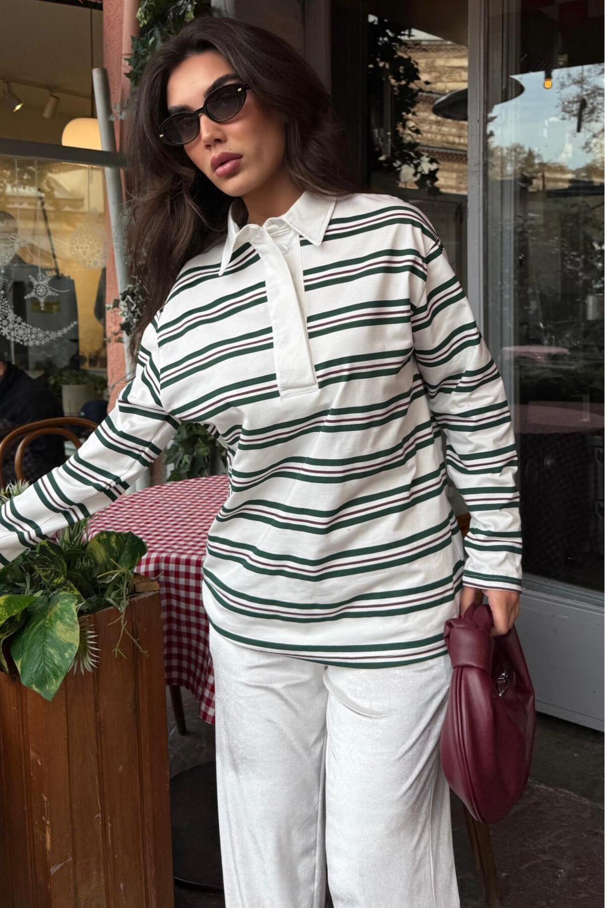 Yeşil Çizgili Düğmeli Polo Yaka Kadın Uzun Kollu Tişört MG2574 Yeşil Çizgili Düğmeli Polo Yaka Kadın Uzun Kollu Tişört MG2574 XL