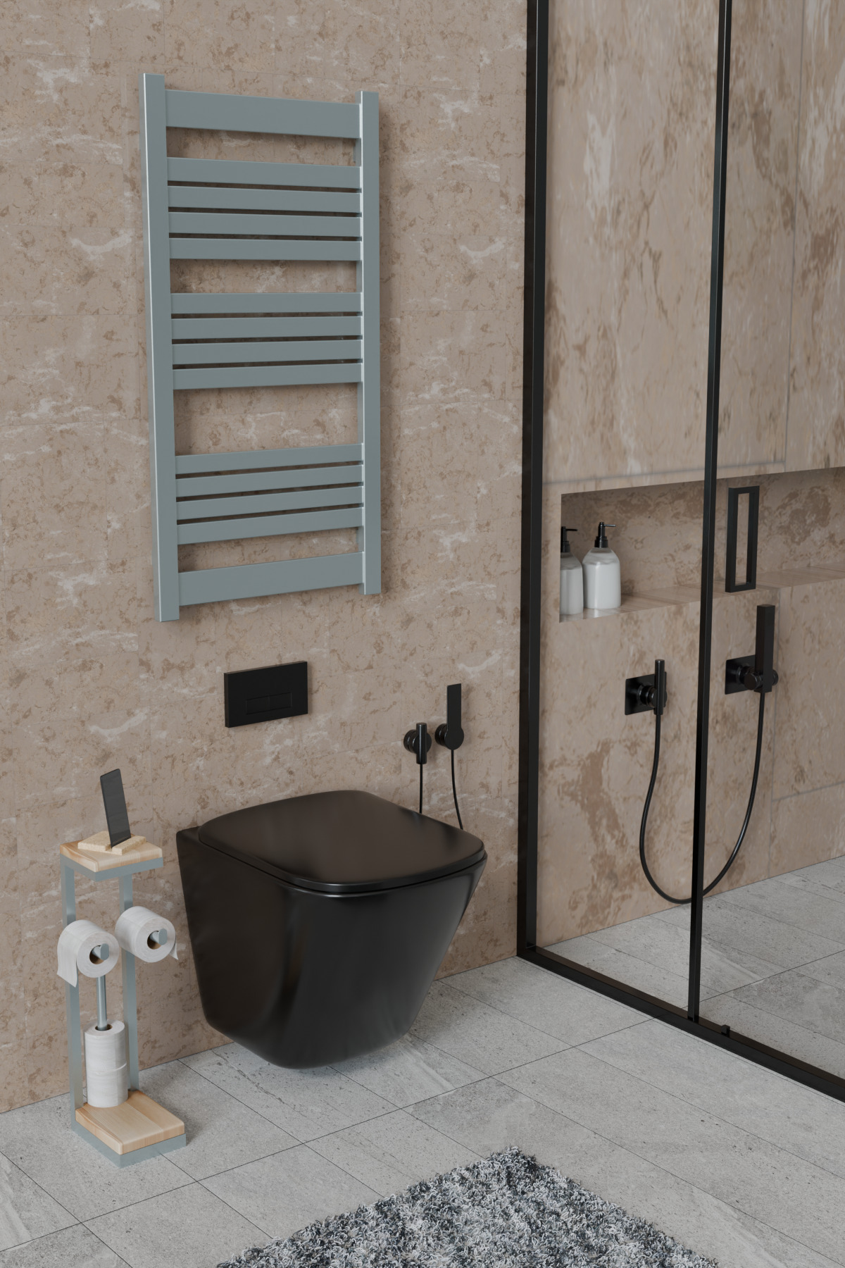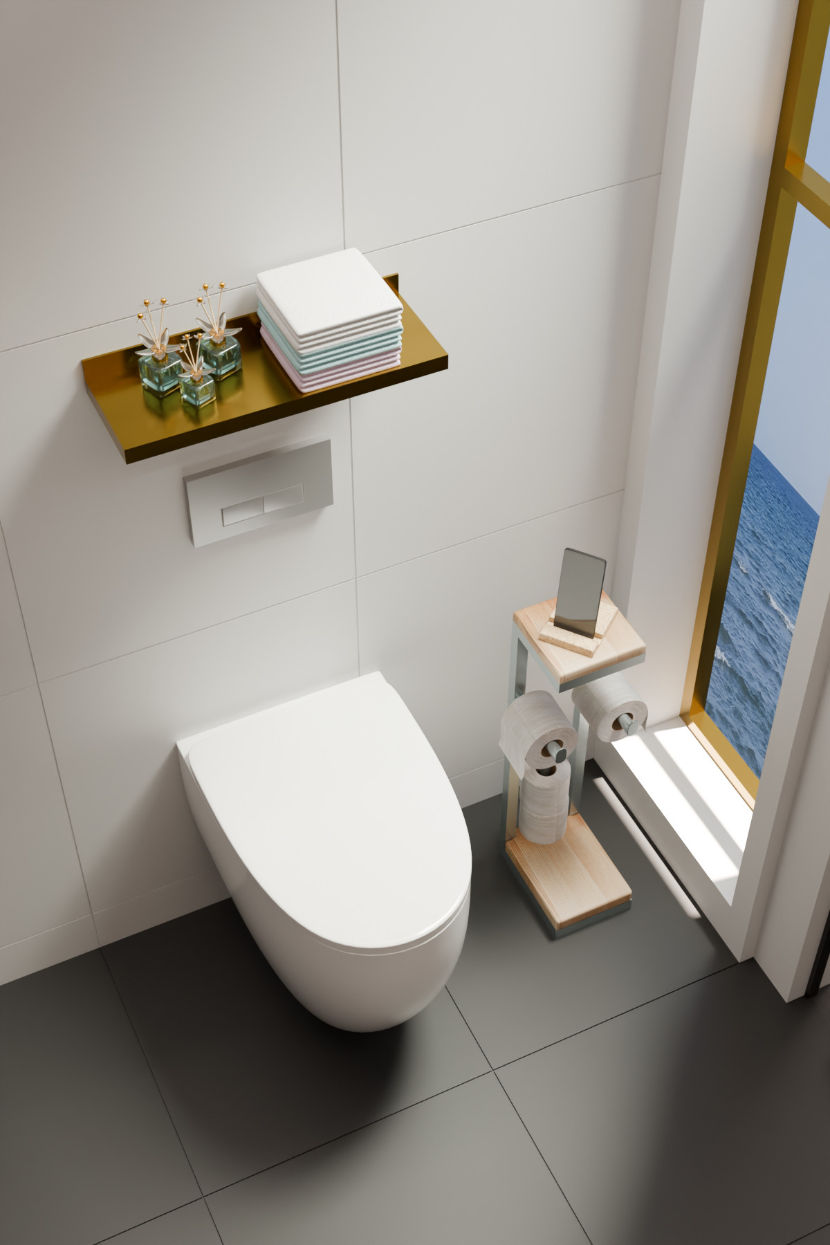 Ahşap Raflı Yedek Bölmeli Dekoratif Ayaklı Metal Tuvalet Kağıtlığı Gümüş Gri