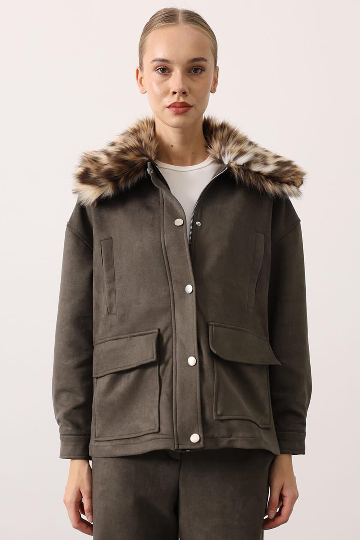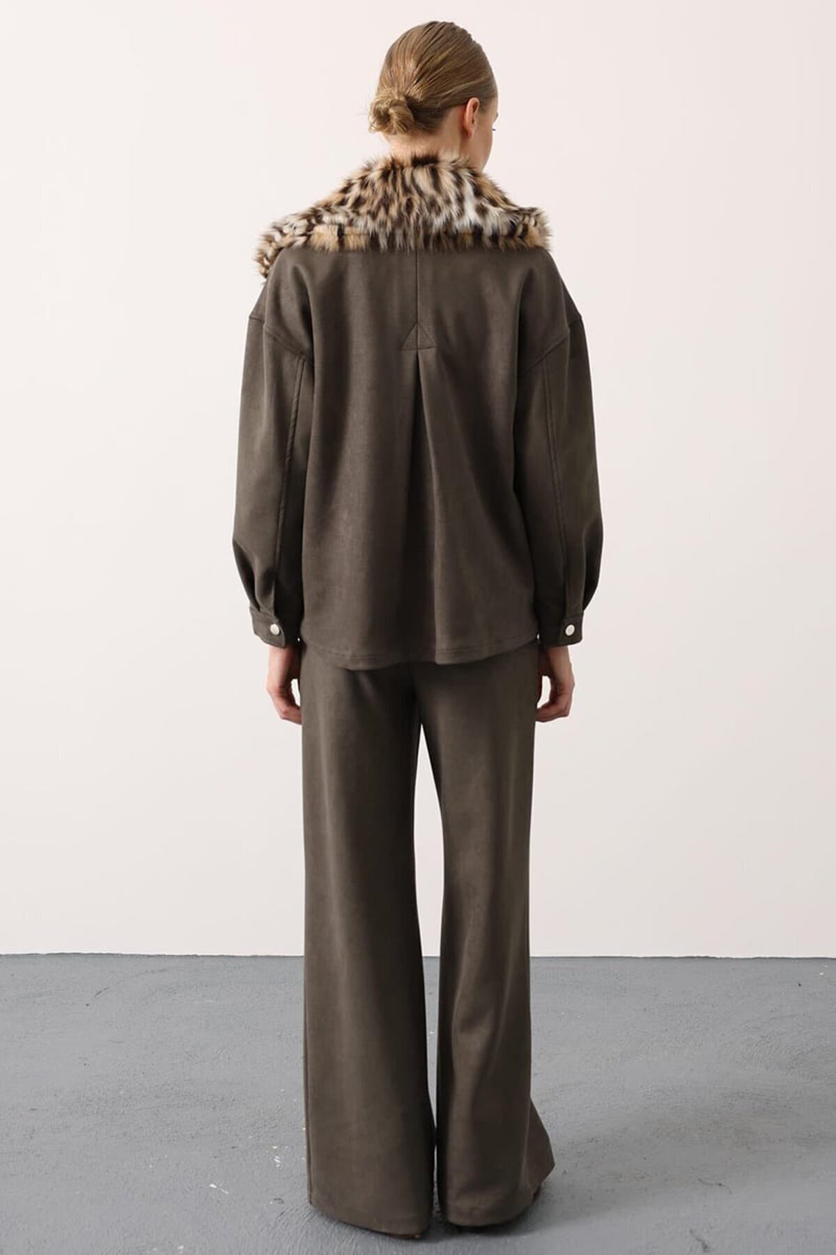Kadın Haki Yakası Kürklü Çift Cepli Ceket Ve Palazzo Pantolon Süet Takım Vs01627 Kadın Haki Yakası Kürklü Çift Cepli Ceket Ve Palazzo Pantolon Süet Takım Vs01627 VS01627 L