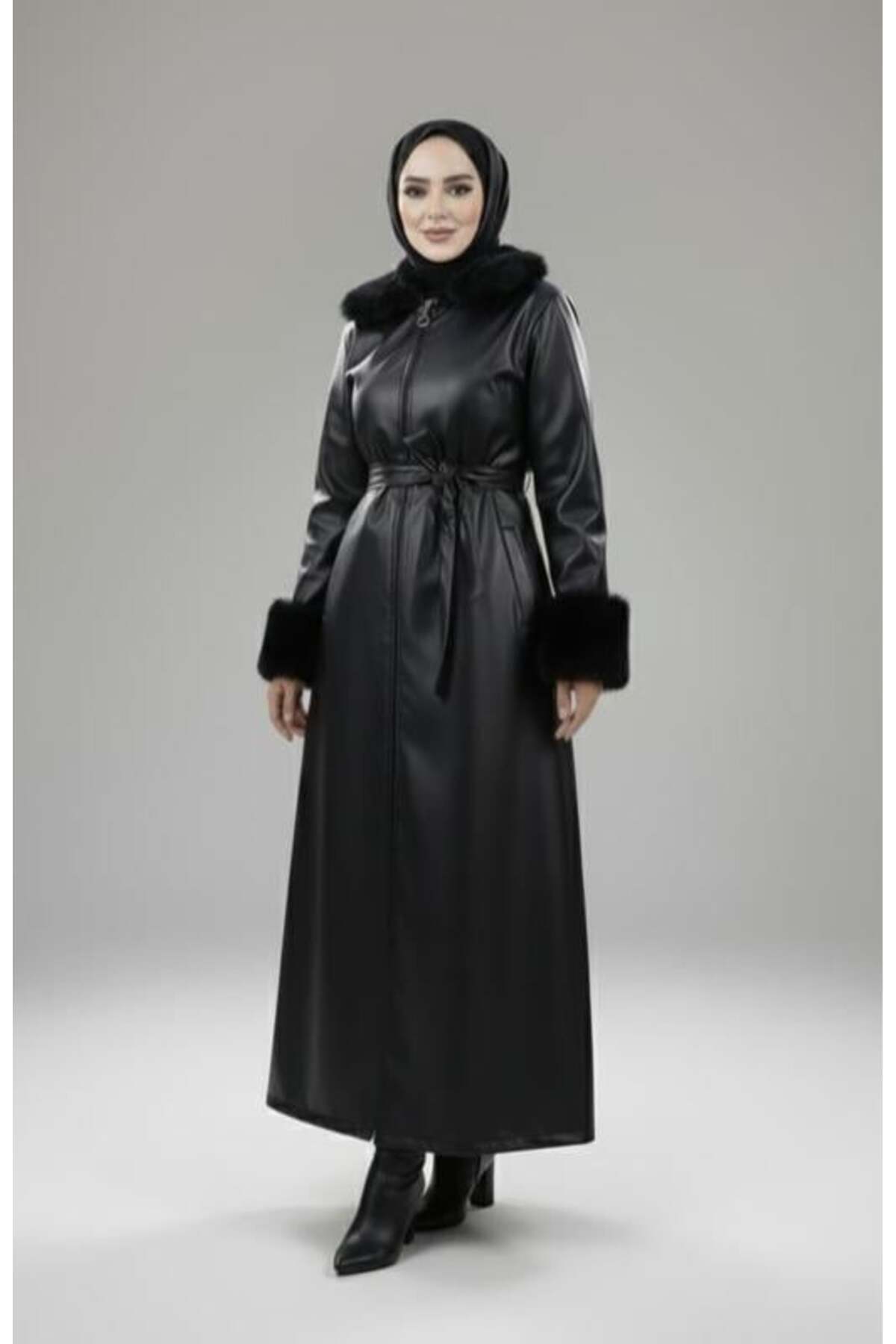 Kadın Fermuarlı Kuşaklı Yakası Tüylü Astarlı Deri Siyah Kap Kadın Fermuarlı Kuşaklı Yakası Tüylü Astarlı Deri Siyah Kap 0103 42