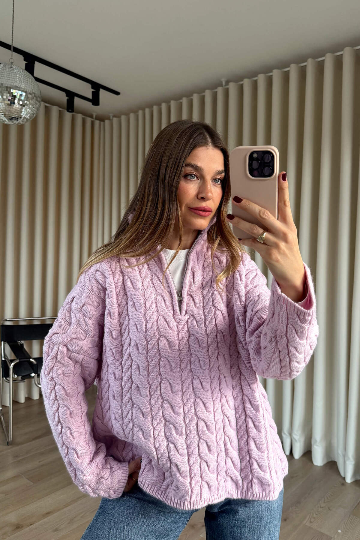 Toz Pembe Fermuarlı Saç Örgü Kazak Toz Pembe Fermuarlı Saç Örgü Kazak KZK1007 Standart