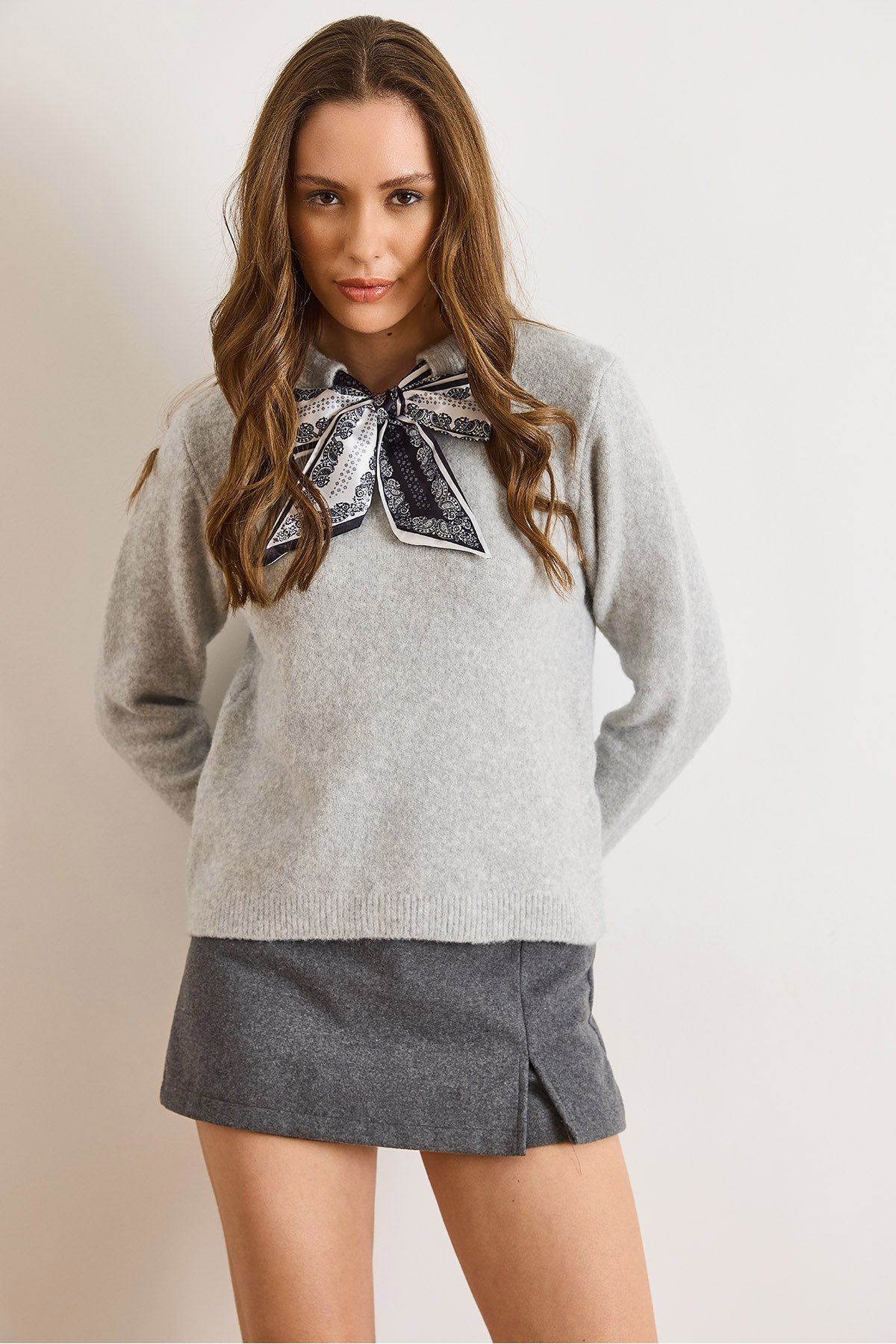 Kadın Gri Fular Detaylı Yumuşak Dokulu Uzun Kol Triko Kazak KZK-19001085 Kadın Gri Fular Detaylı Yumuşak Dokulu Uzun Kol Triko Kazak KZK-19001085 تک سایز